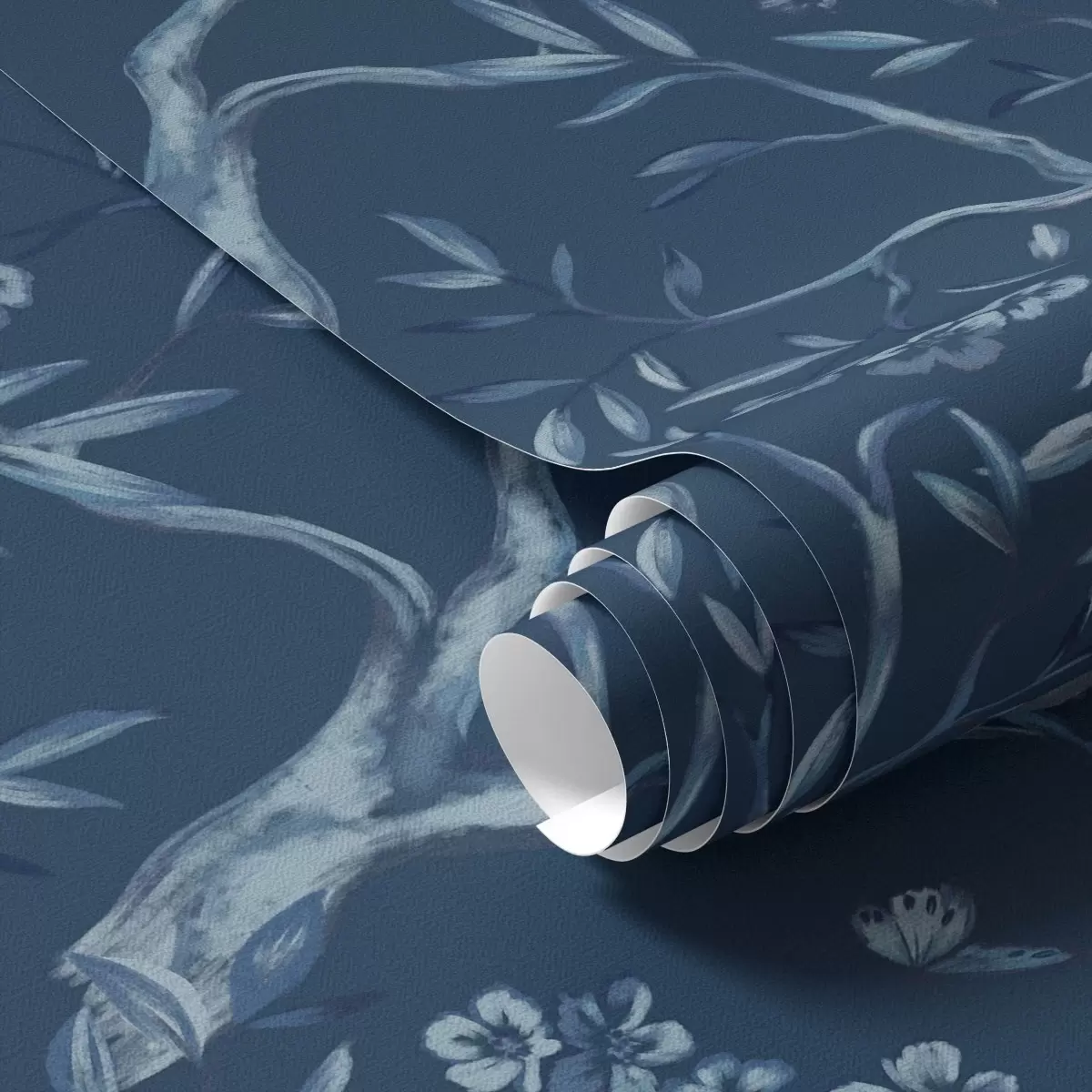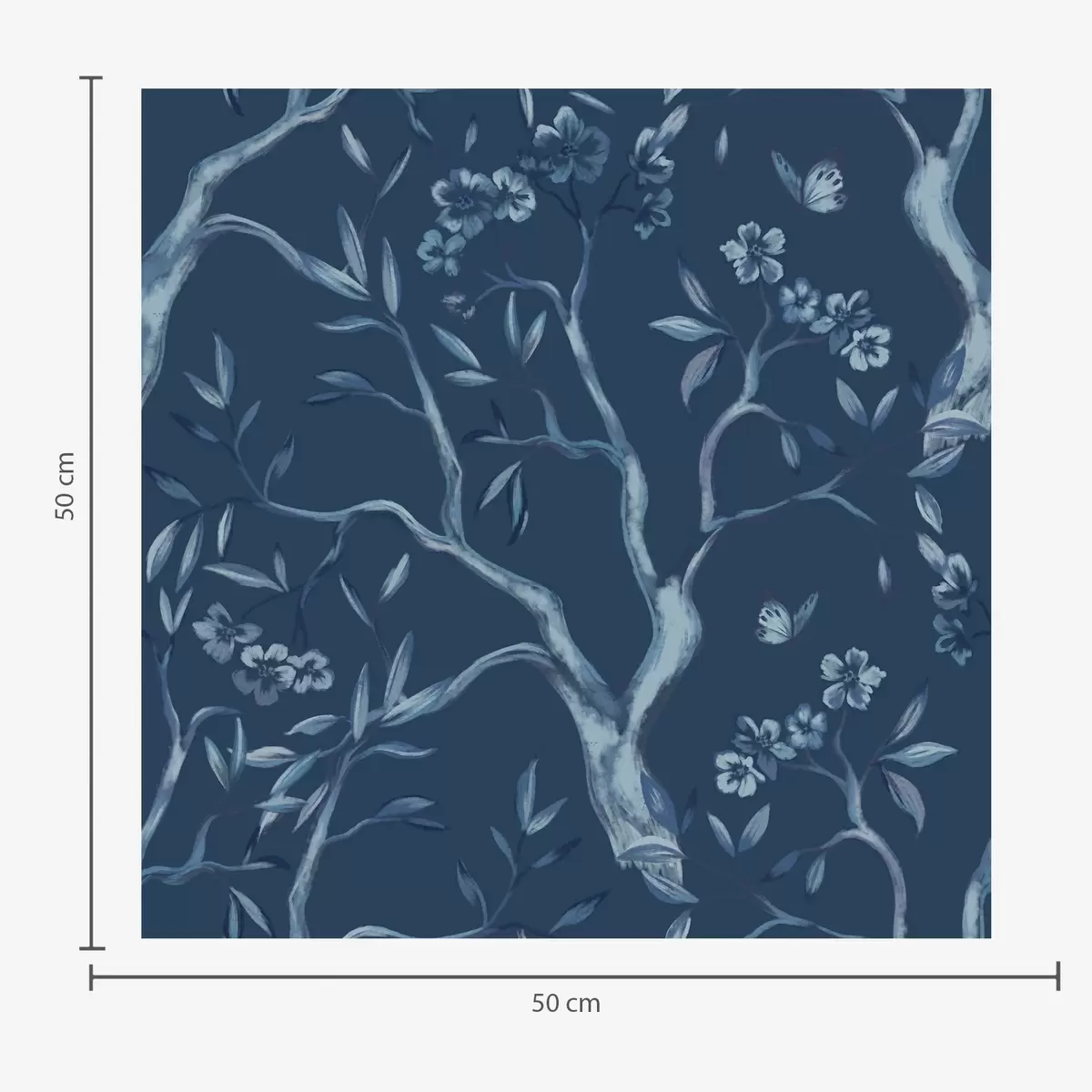 Behang Blauwe bloeiende takken met vlinders op een donkere achtergrond Nr. a00951v1