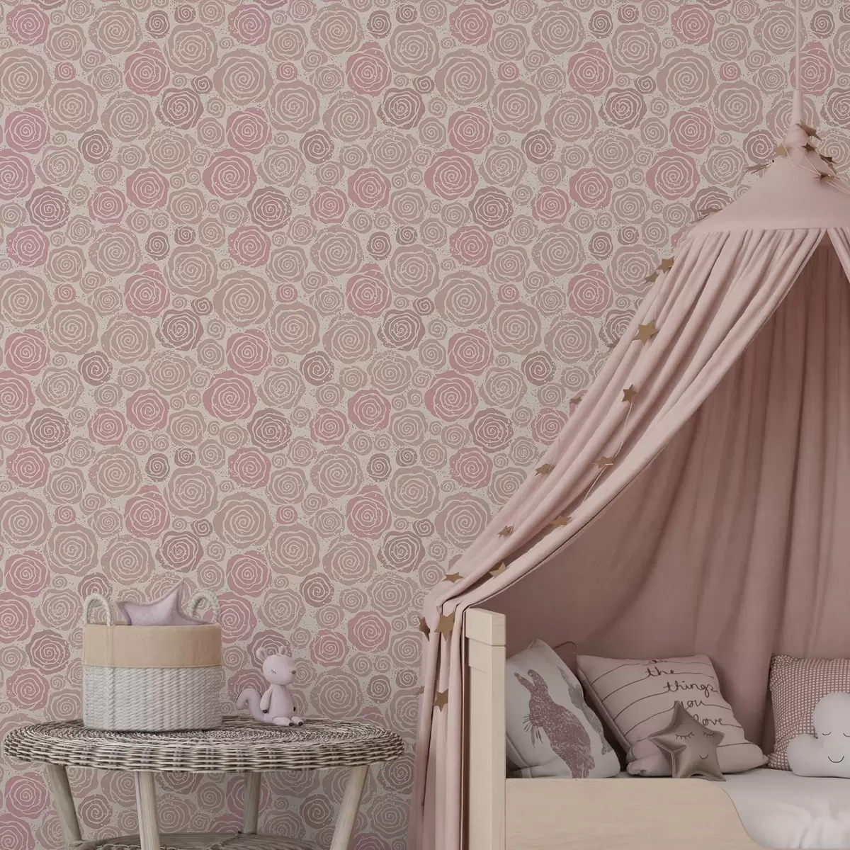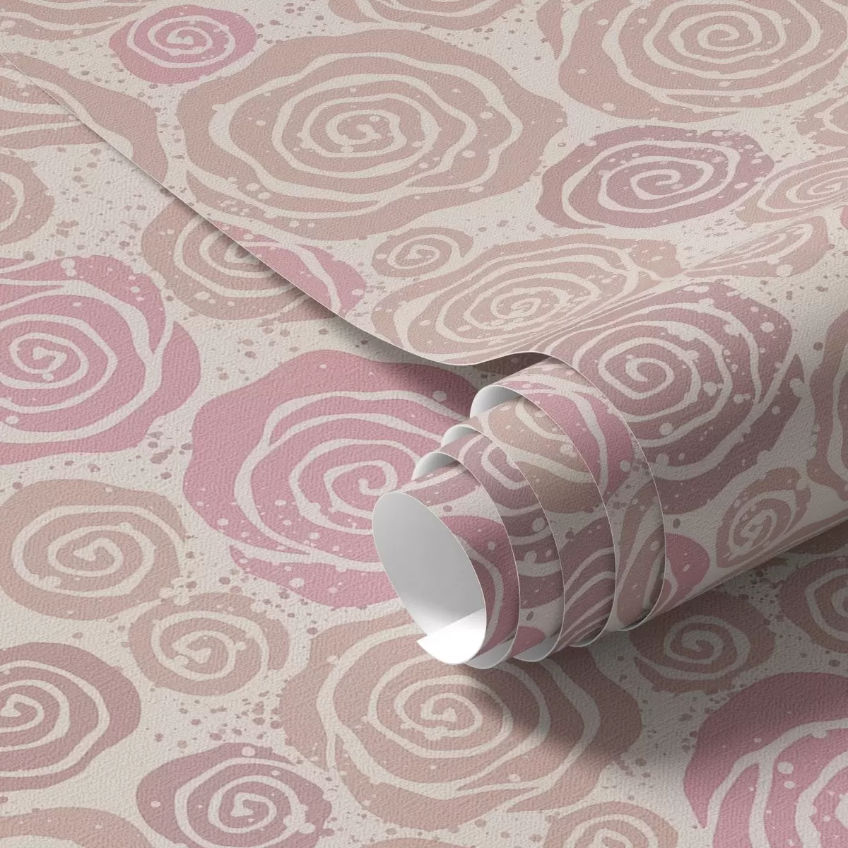 Behang Spiraalvormige roze rozen en spatten op een lichte achtergrond Nr. a00955