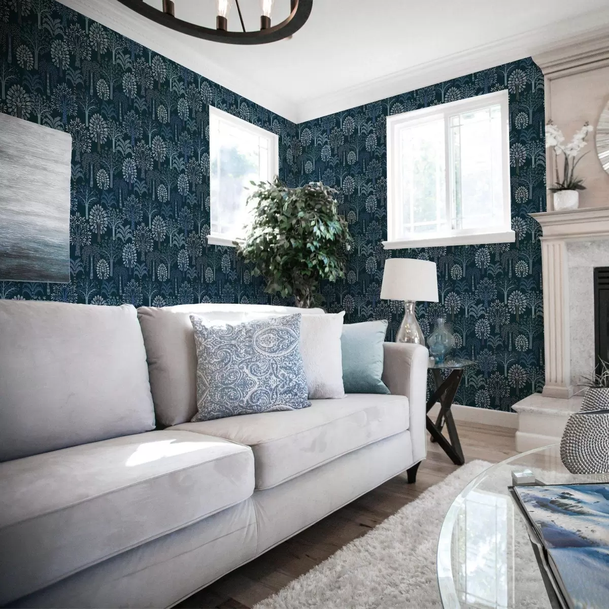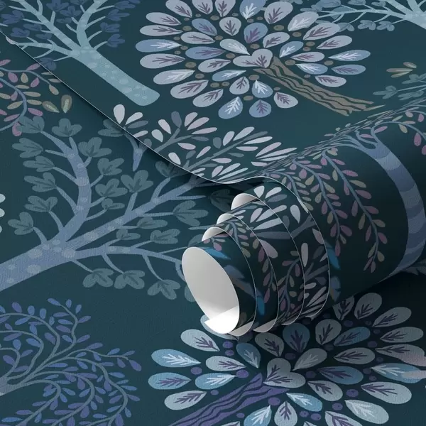 Behang Nachtelijk bos met decoratieve bomen in blauwe tinten Nr. a00960v2