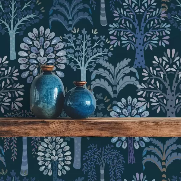 Behang Nachtelijk bos met decoratieve bomen in blauwe tinten Nr. a00960v2