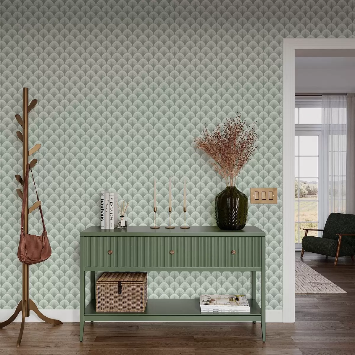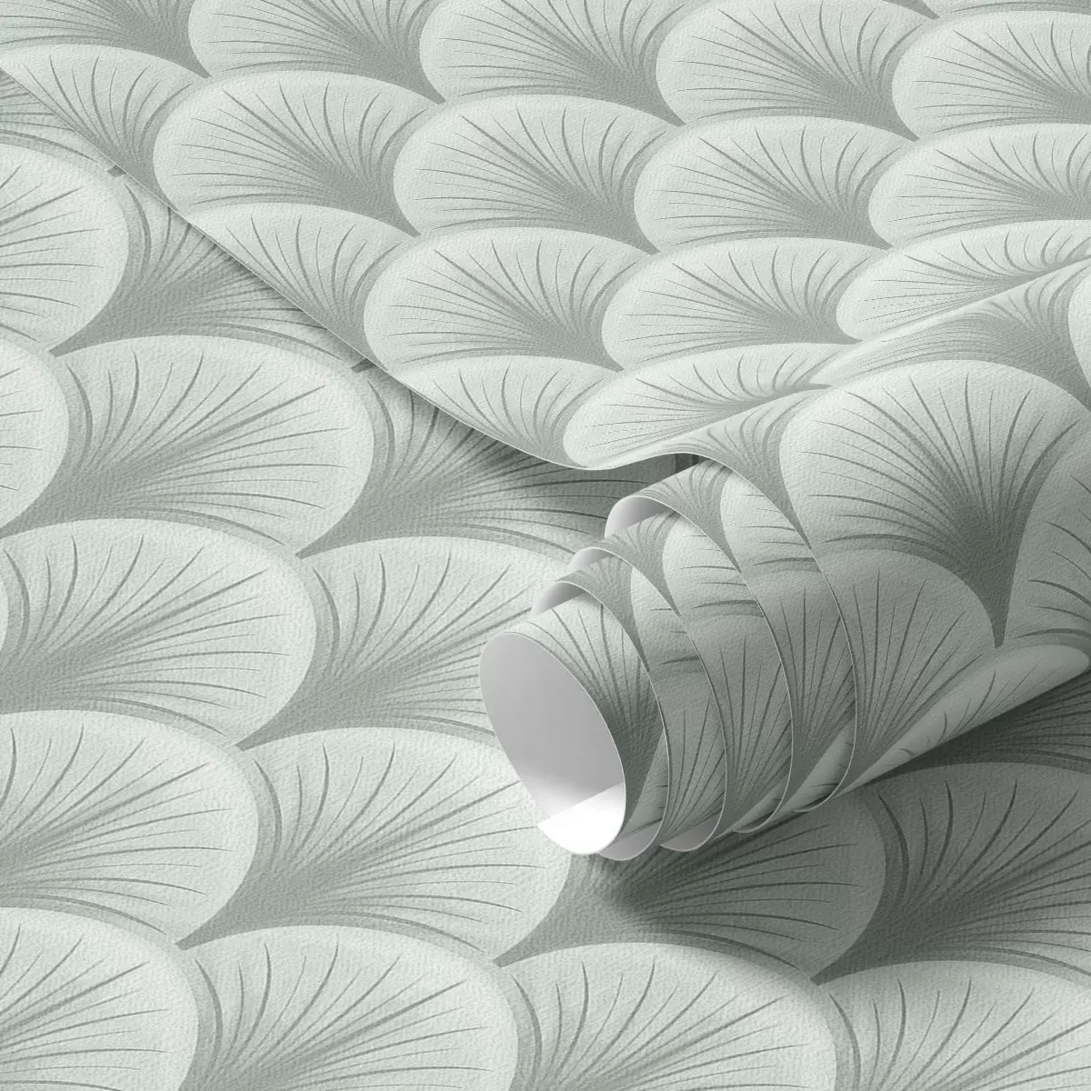 Behang Muntventilatorbogen met stralen op een zachte groenachtige achtergrond Nr. a00978v2