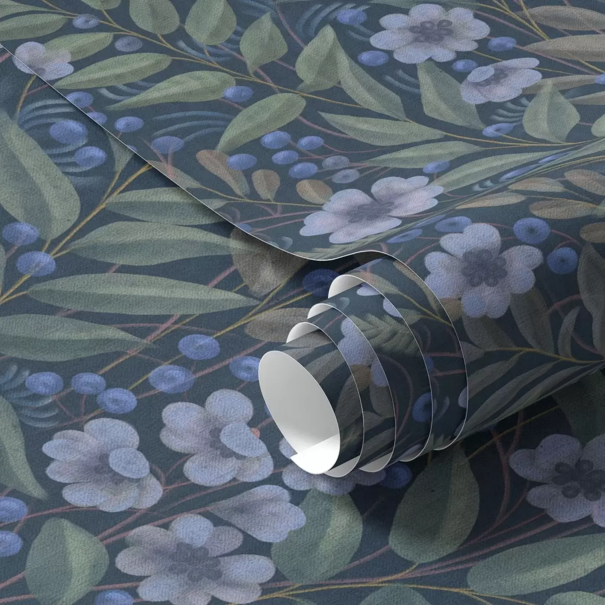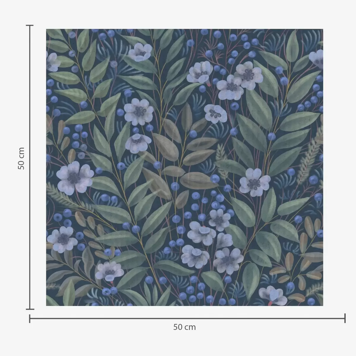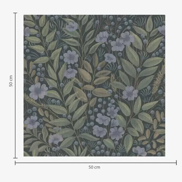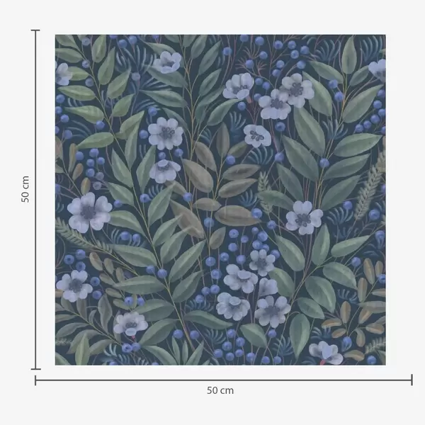 Behang Middernachtblauwe bessen en witte bloemen in dicht gebladerte Nr. a00994