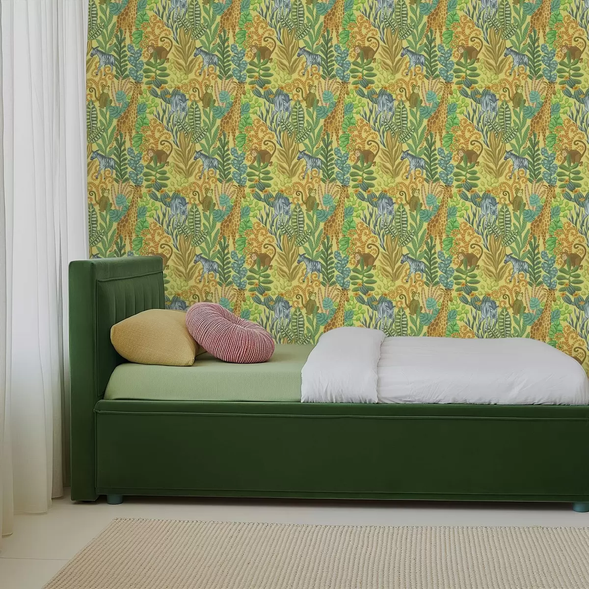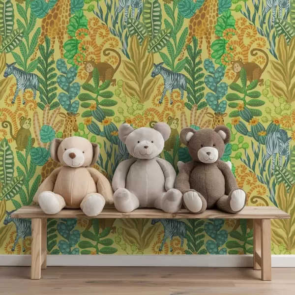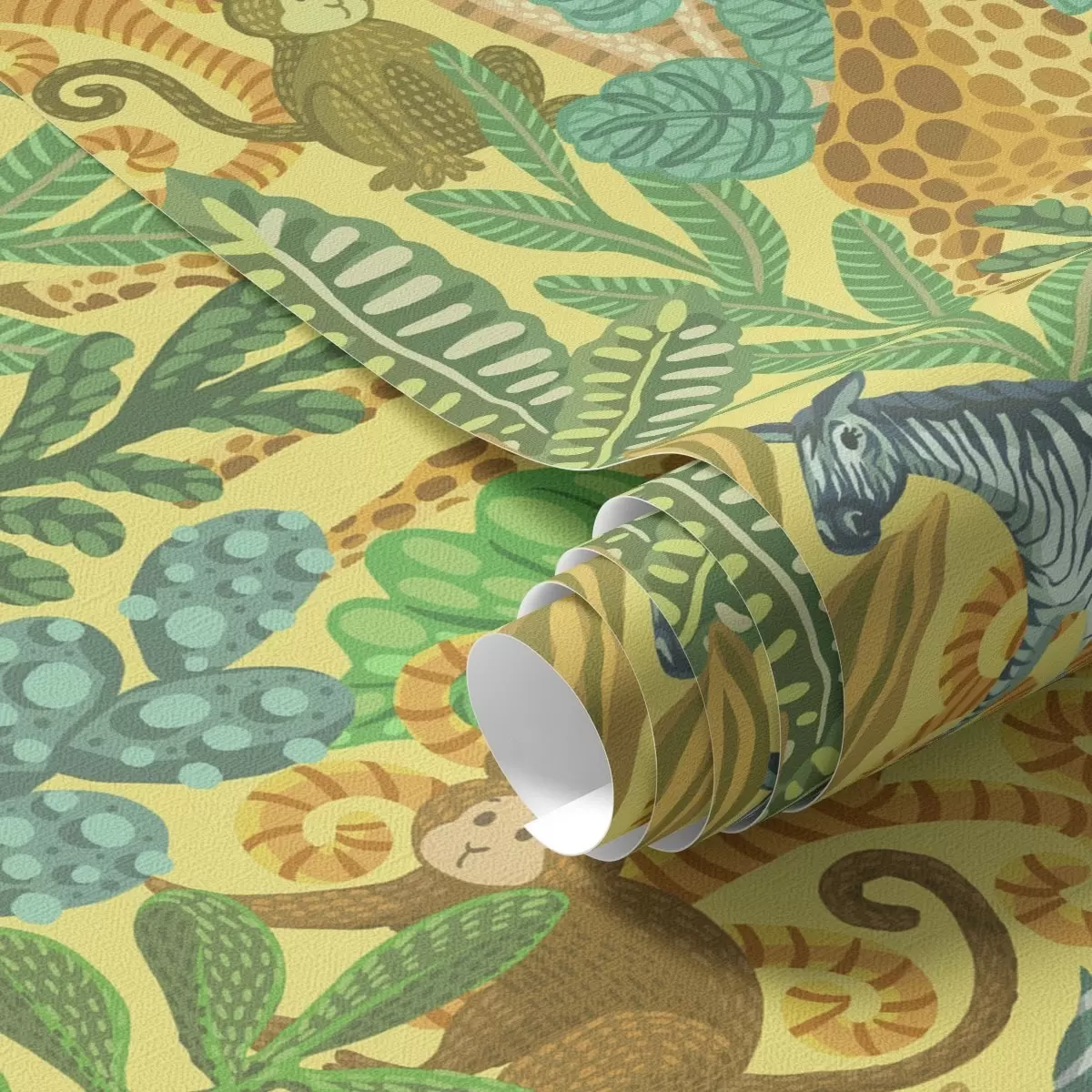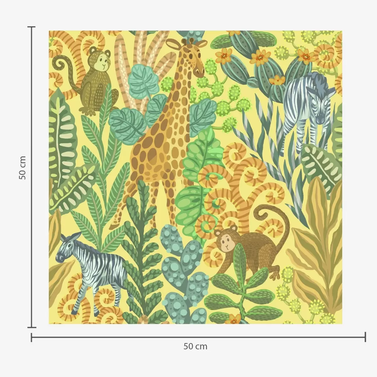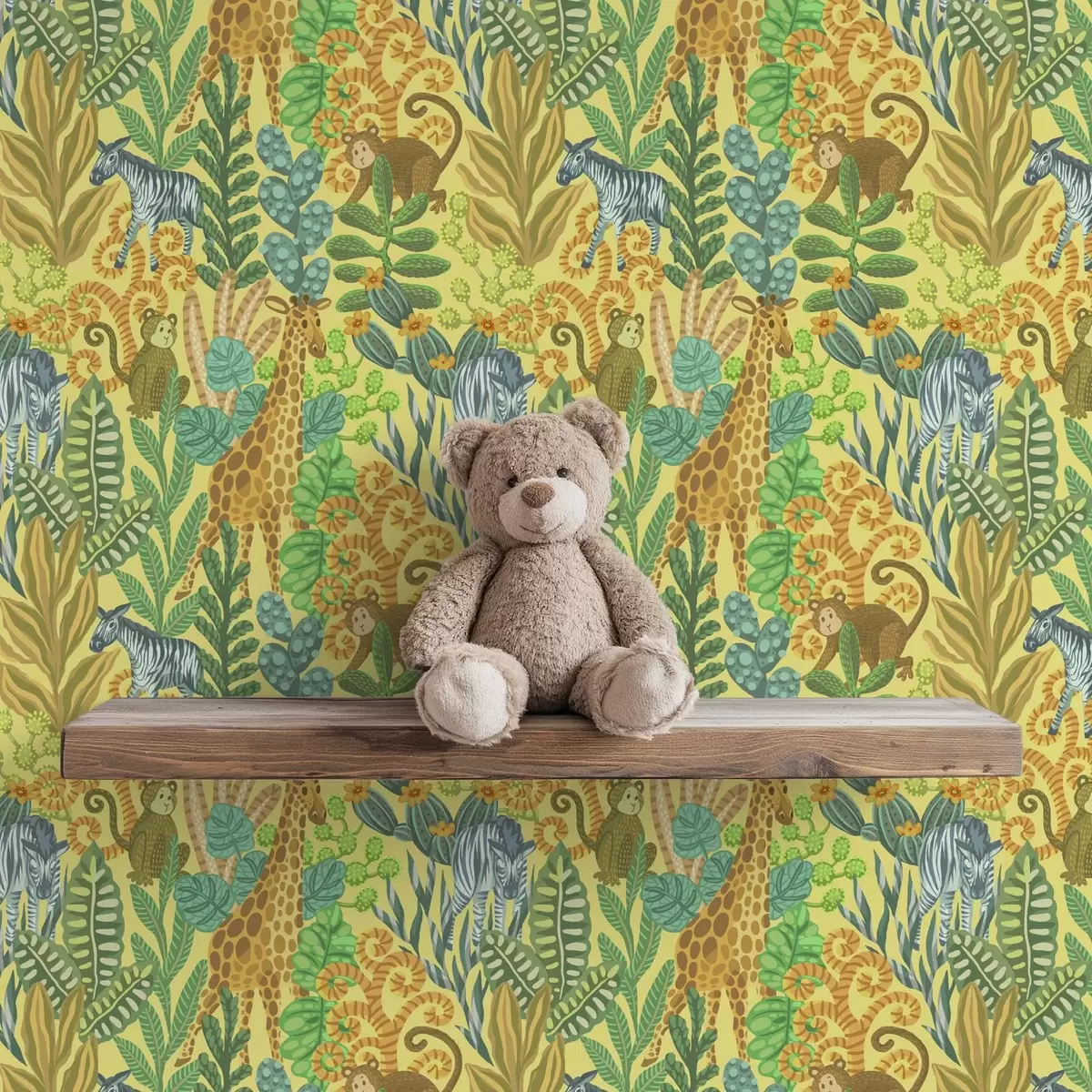 Behang Giraffe, zebra en aap in een felgele savanne Nr. a01000v1