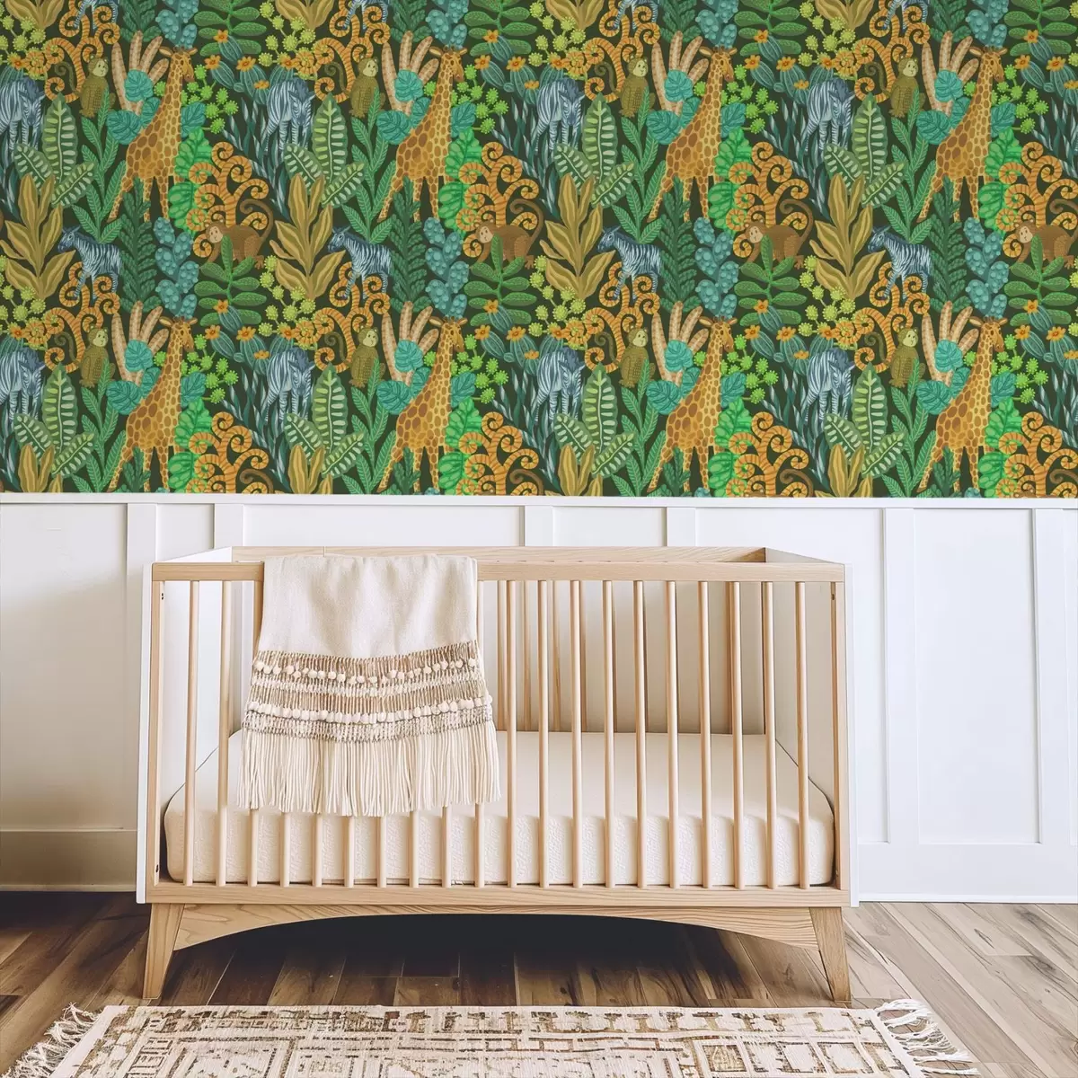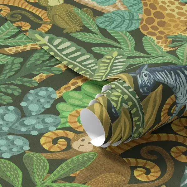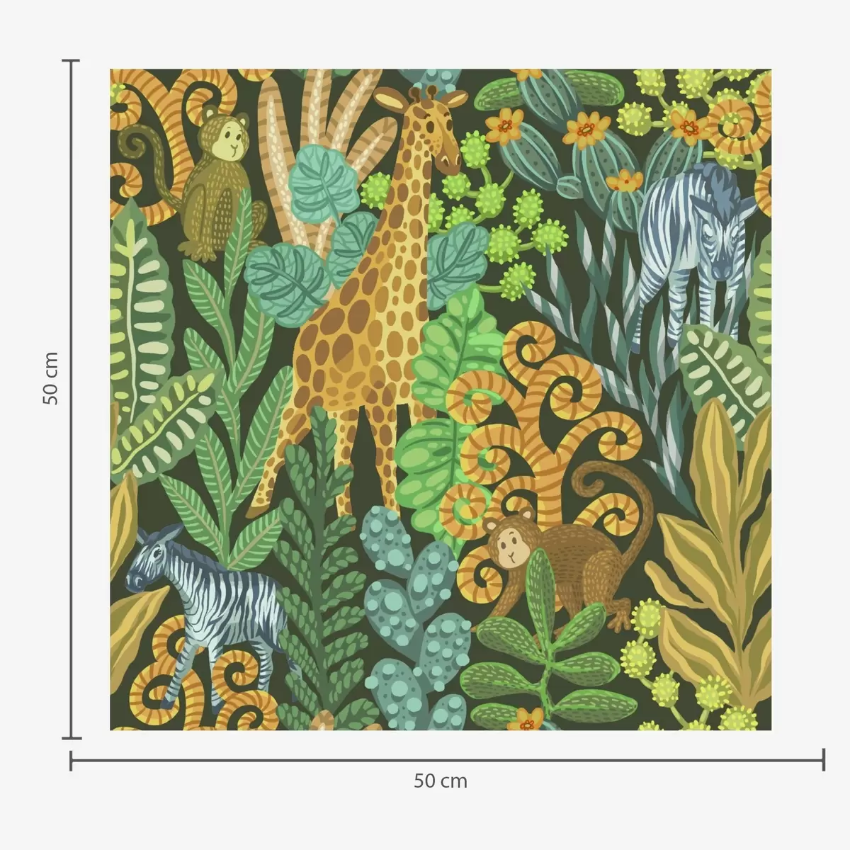 Behang Dichte jungle met dieren op een donkergroene achtergrond Nr. a01000v2