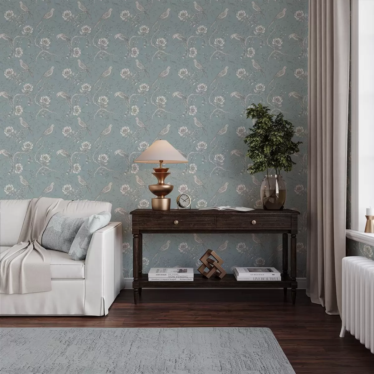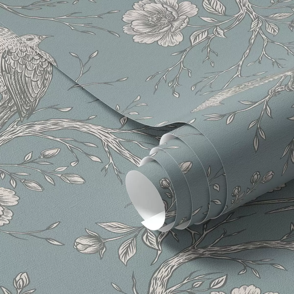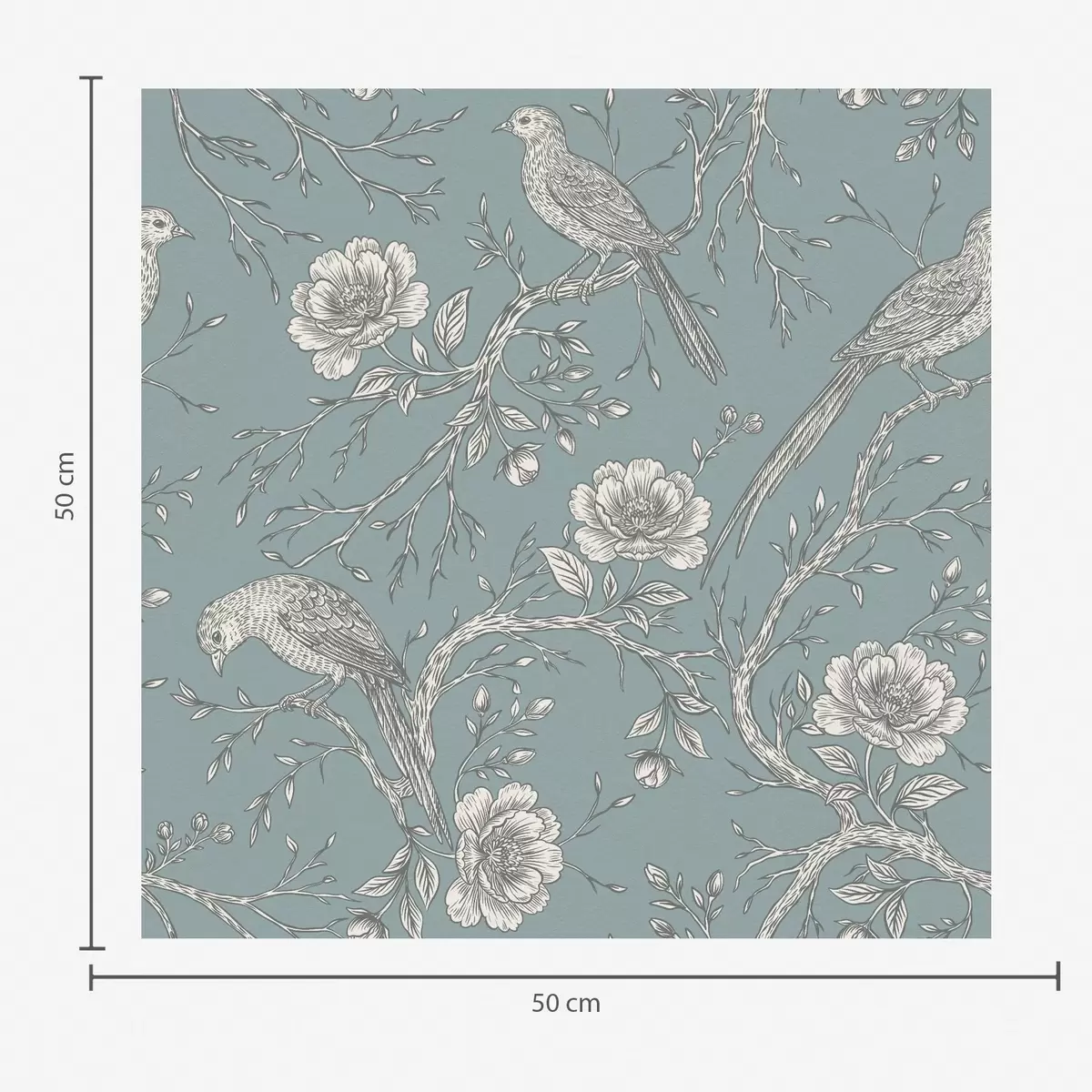 Behang Contourgetekende vogels op takken, gedempte blauwe achtergrond Nr. a01022