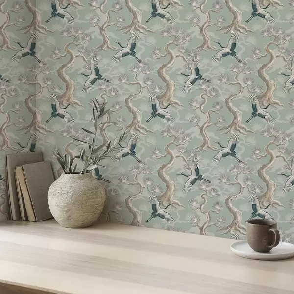 Behang Kranen tussen gebogen takken op een zachte saliekleurige achtergrond Nr. a01023
