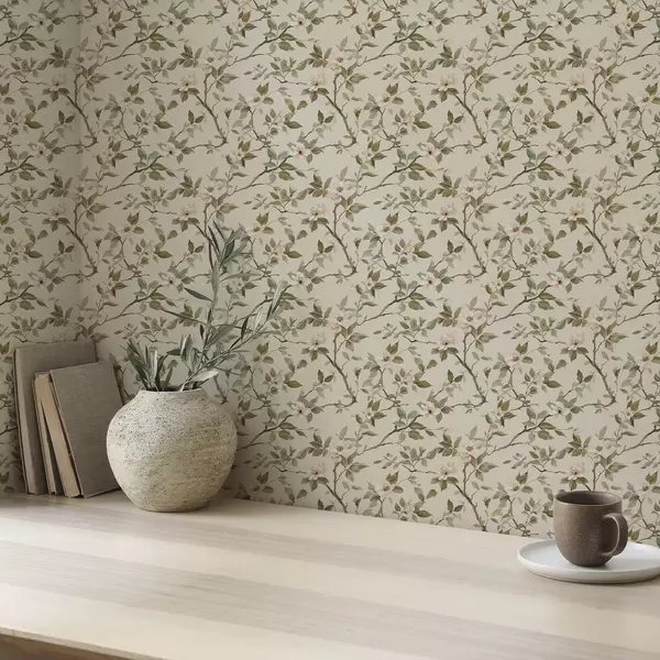 Behang Lichte takken met kleine crèmekleurige bloemen en groene bladeren Nr. a01028
