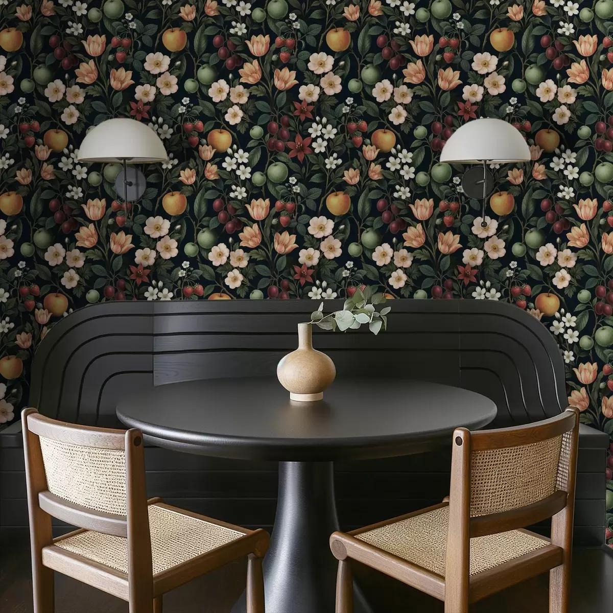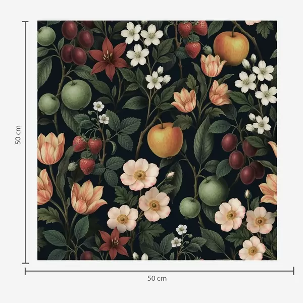 Behang Donkere tuin met bloemen, rijpe appels en bessen Nr. a01034