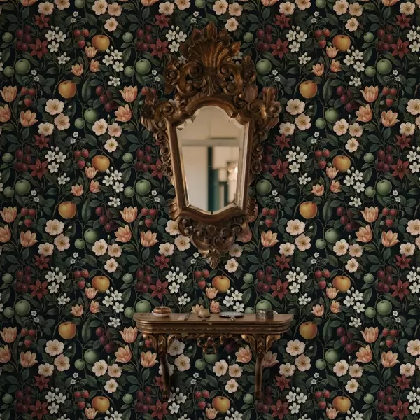 Behang Donkere tuin met bloemen, rijpe appels en bessen Nr. a01034