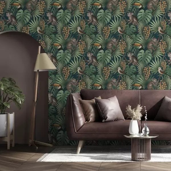 Behang Apen en tropische vogels in dichtbegroeid junglebladerdak Nr. a01037