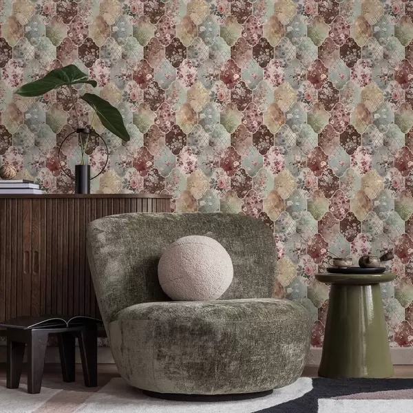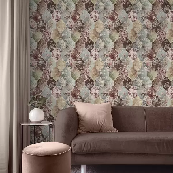 Behang Patchwork van bloemenpanelen en versleten tegels met patronen Nr. a01038