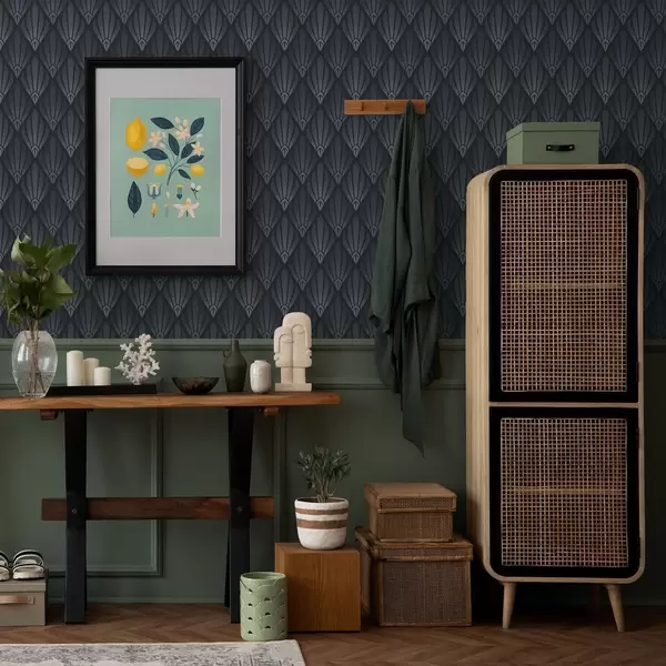 Behang Koel blauwgrijs Art Deco met waaiervormige vormen Nr. a01064v3