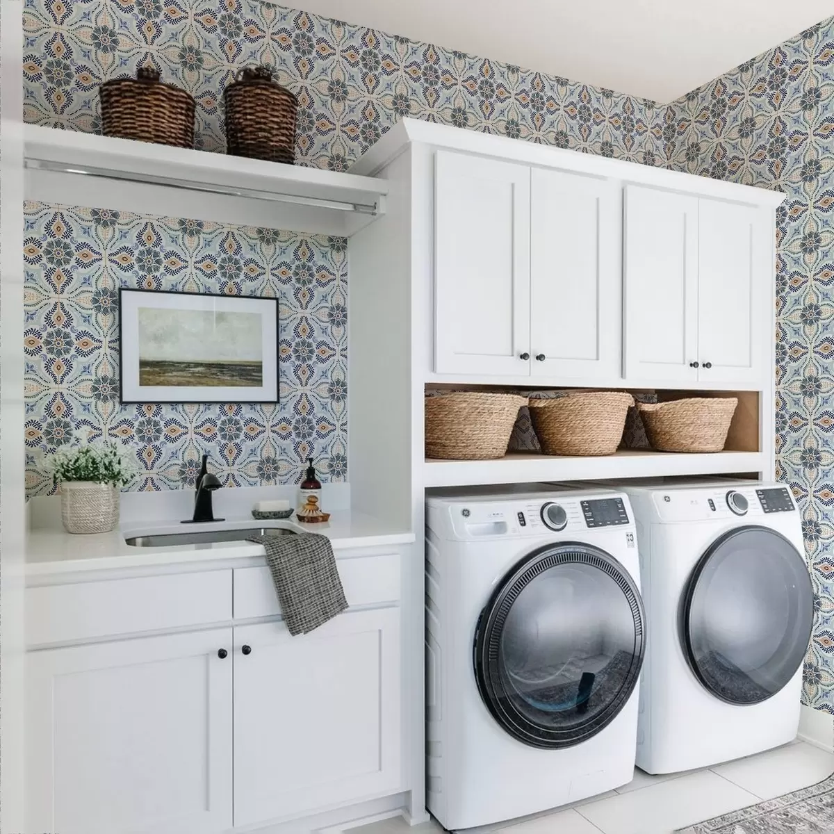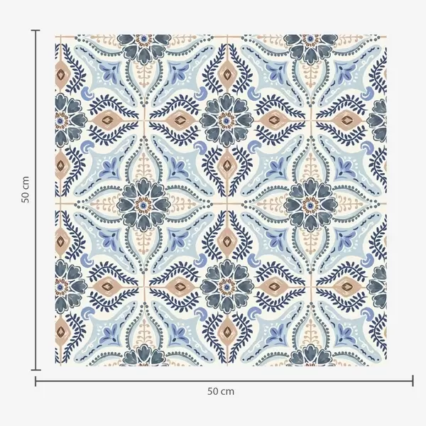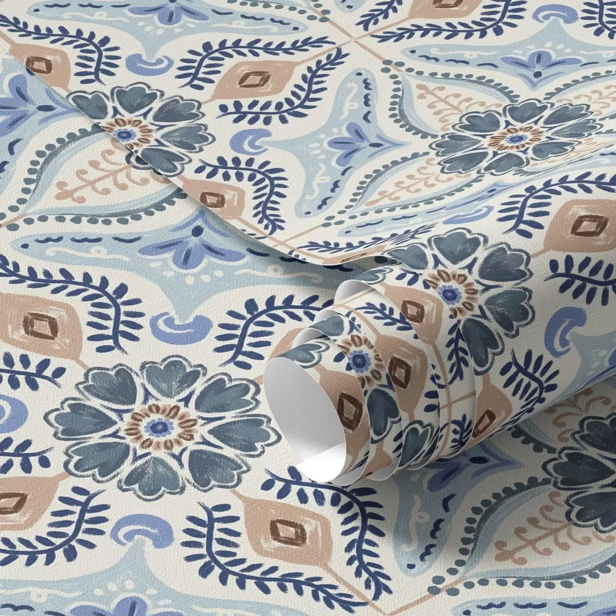 Behang Blauw-beige tegelachtig ornament geschilderd in waterverf Nr. a01085
