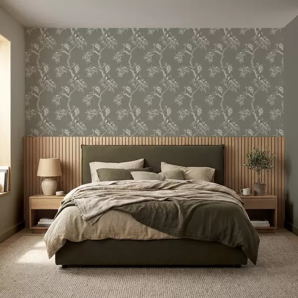 Behang Lichte tak met bladeren op olijfgroene achtergrond a01117v1