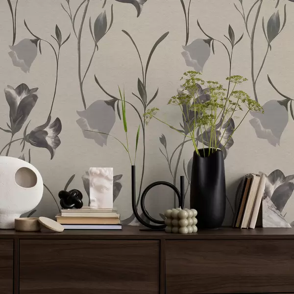 Behang Grijze klokjesbloemen op lichtbeige achtergrond Nr. a01119