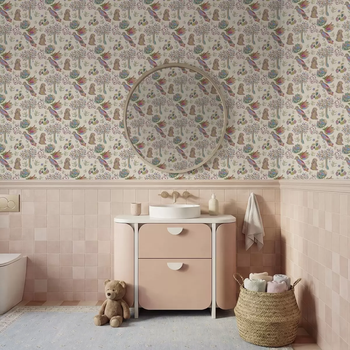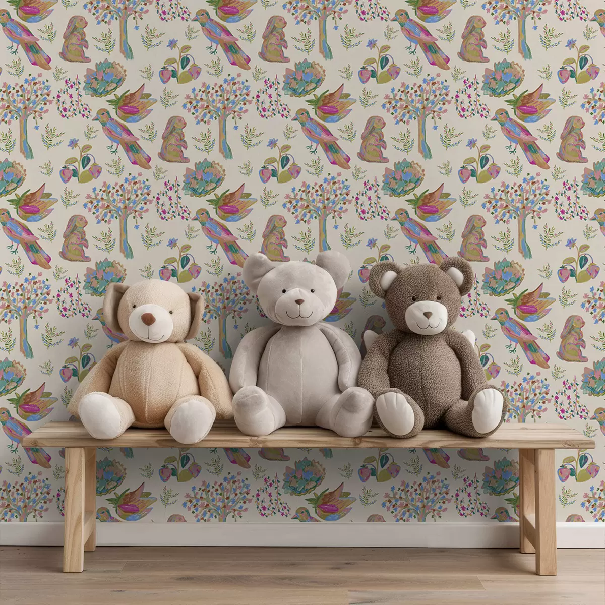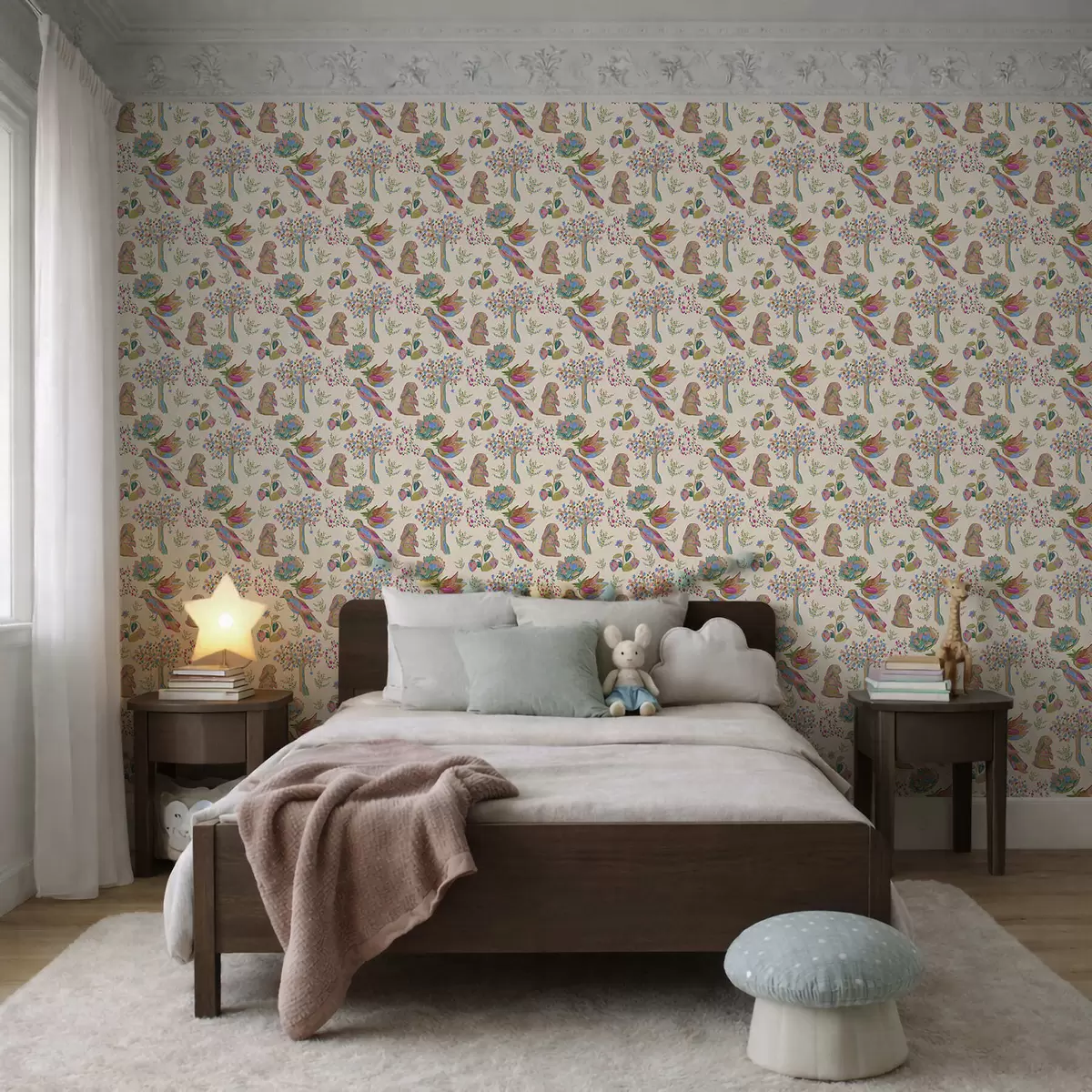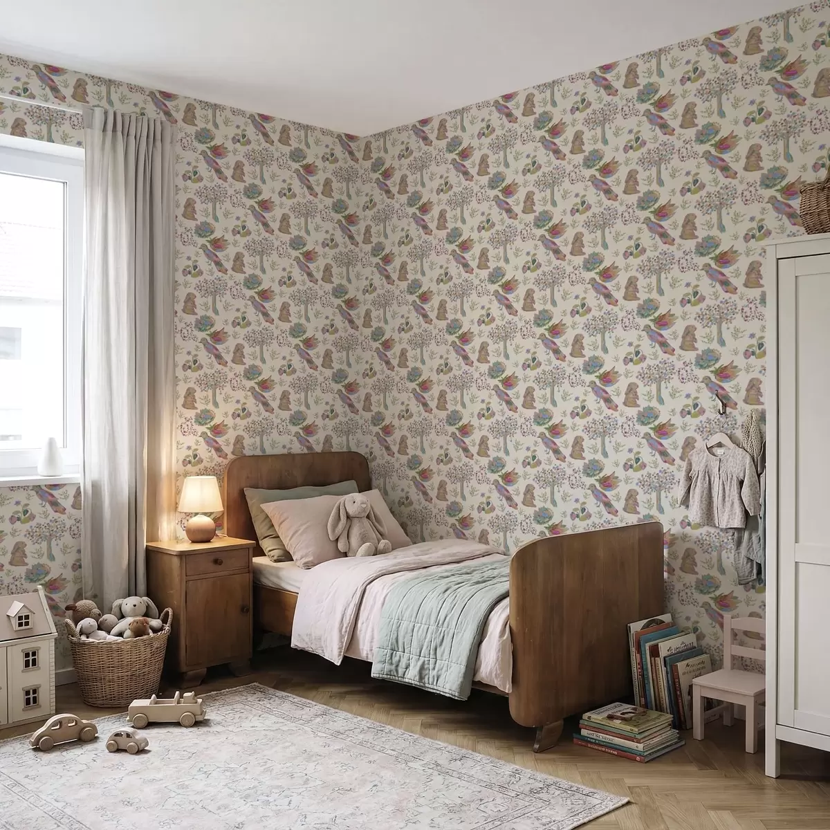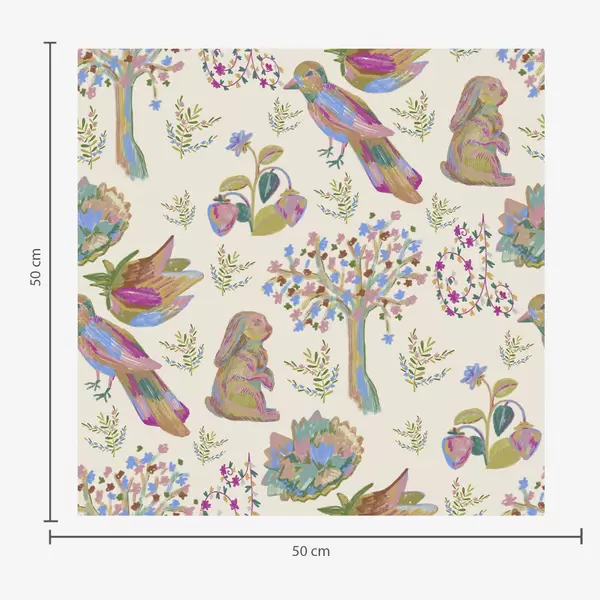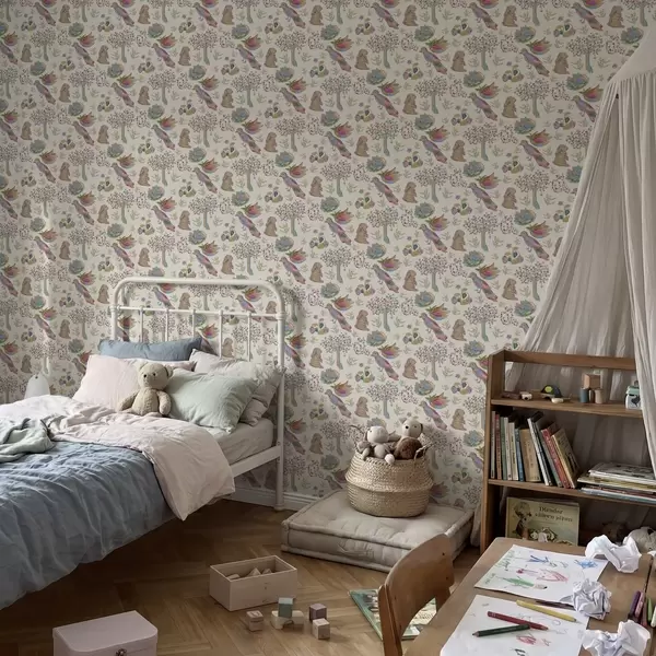 Behang Kleurrijk kinderpatroon met vogels en konijnen Nr. a01127
