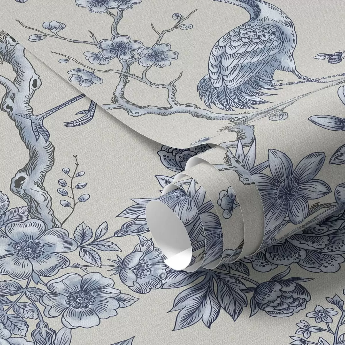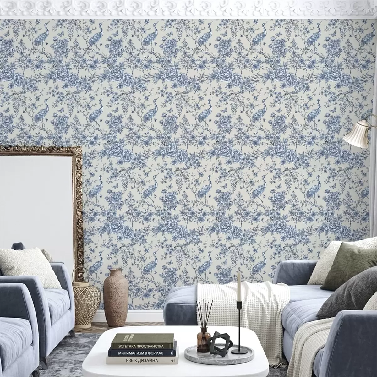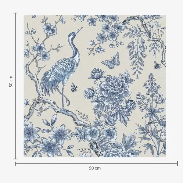 Behang Blauw bloemenmotief met vogel en takken Nr. a01132