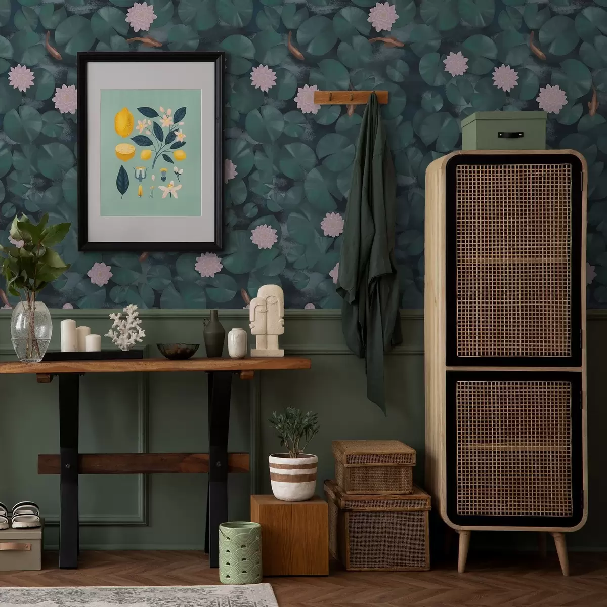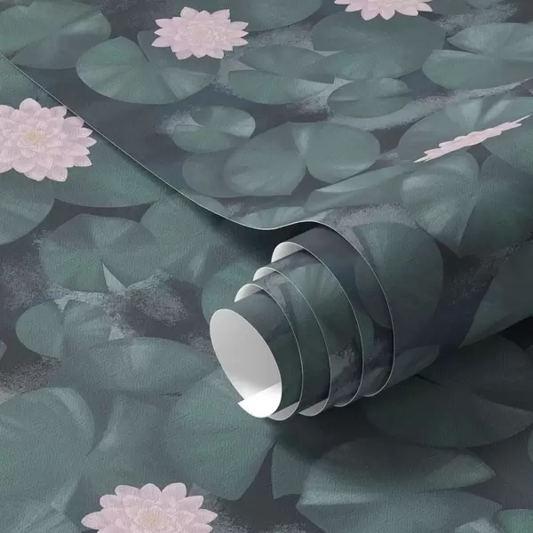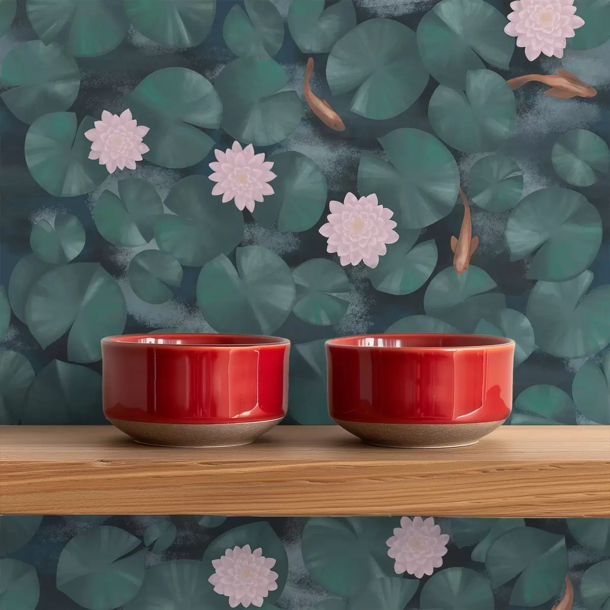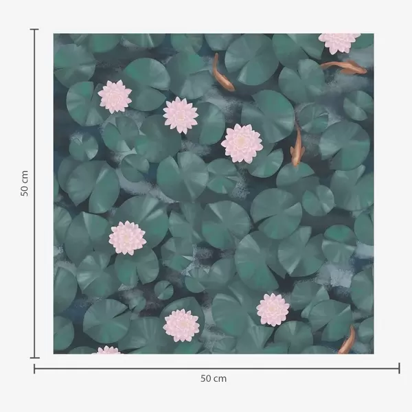 Behang Waterlelies met bloemen en vissen op een donkere achtergrond Nr. a01177