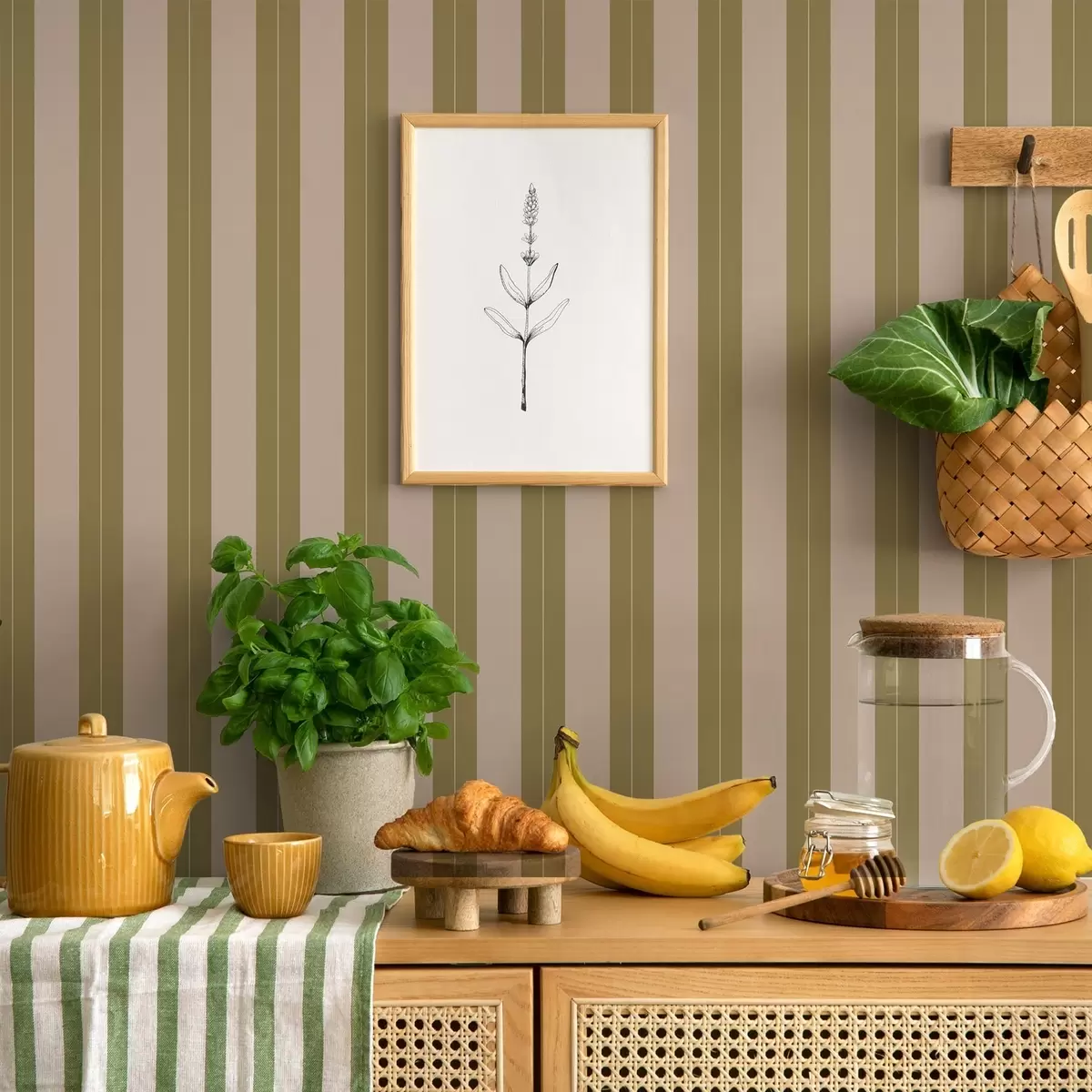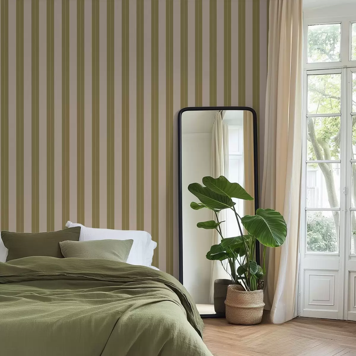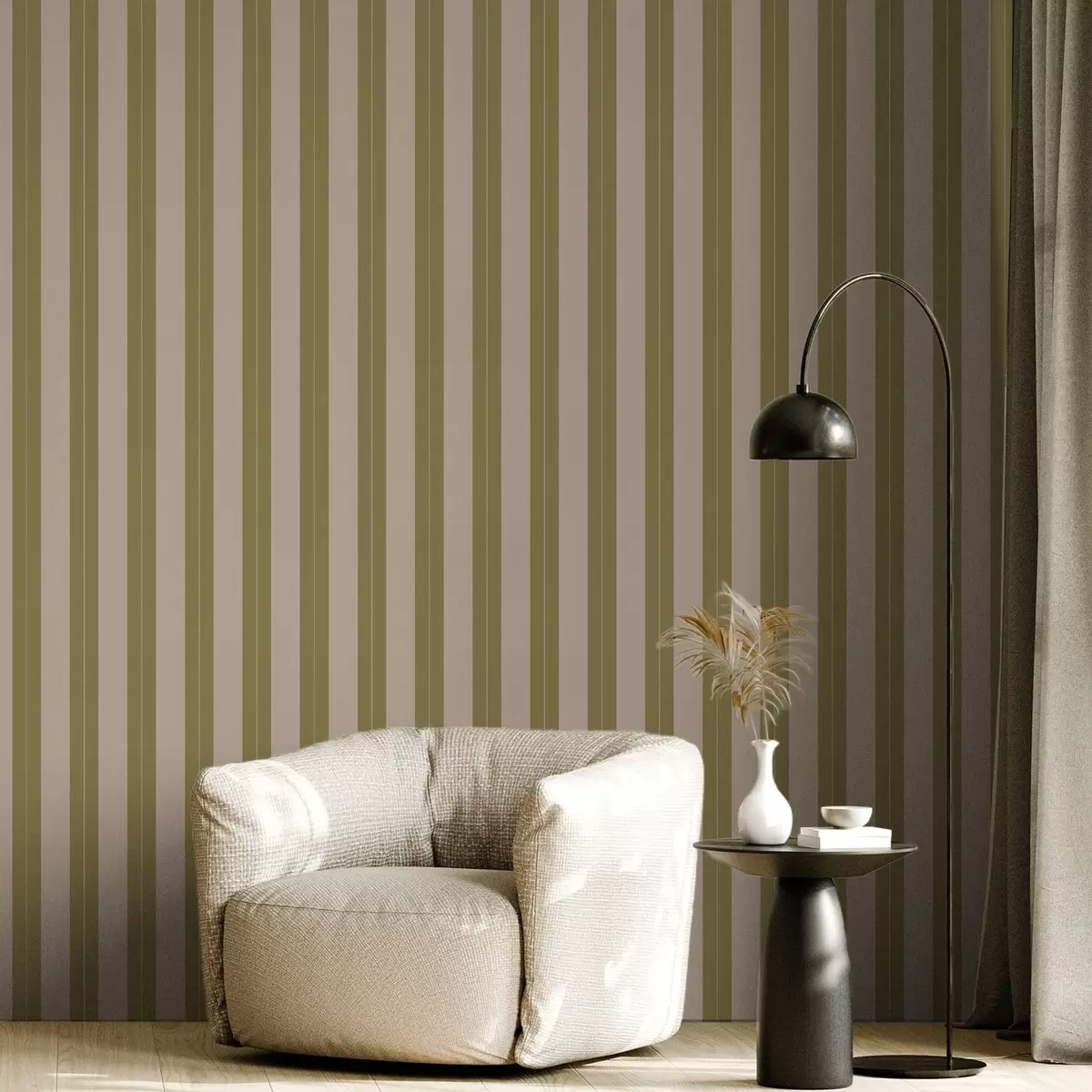 Behang Verticale strepen in olijfgroen en beige Nr. a01181v2