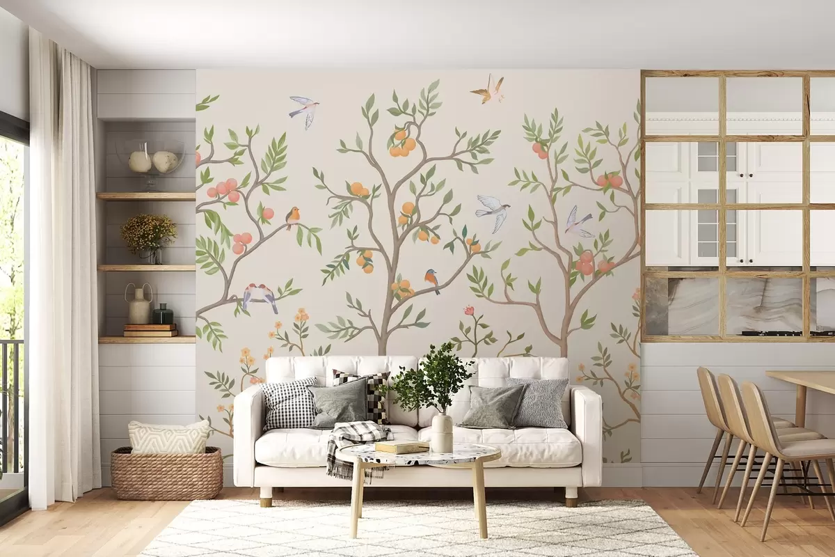 Fotobehang Chinoiserie-ontwerp met vogels, kronkelende bomen, vruchten en bloemen N° w02128