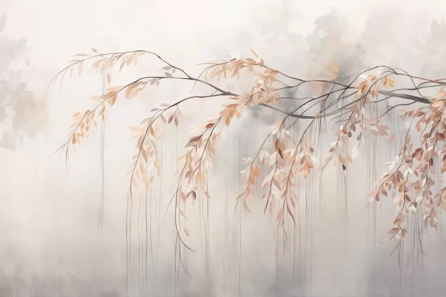 Muurschildering Een tak met licht oranje bladeren opknoping naar beneden, lichtgrijze textuur wazige achtergrond, zachte en delicate stijl