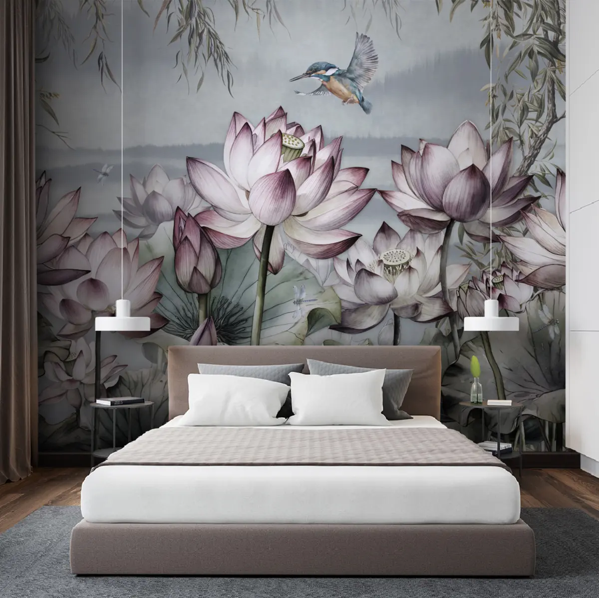 Fotobehang Landschap lotusbloem met ijsvogel N° u95397