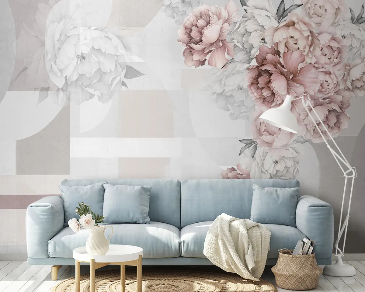 Fotobehang Aquarel pioenrozen in roze kleur met geometrische achtergrond N° u95855