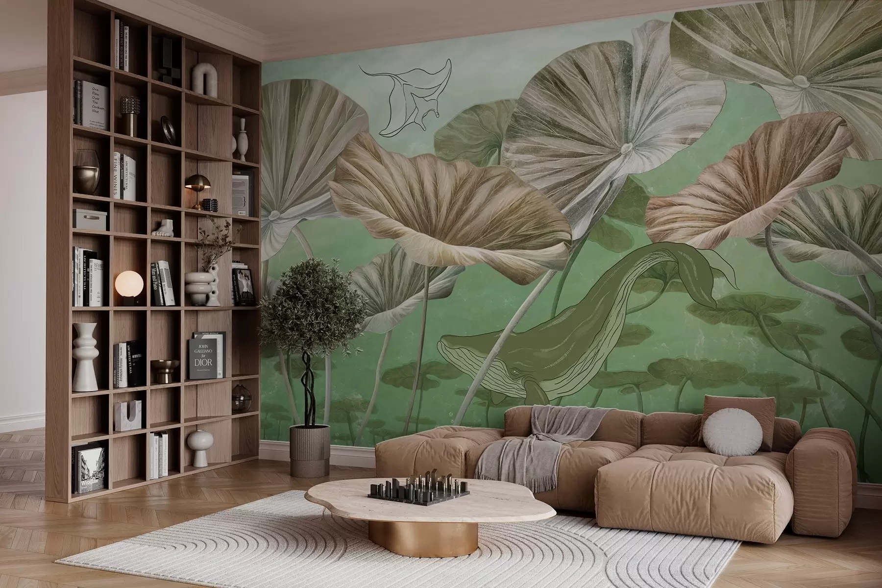 Muurschildering Walvis tussen reuzenlotussen in groen water