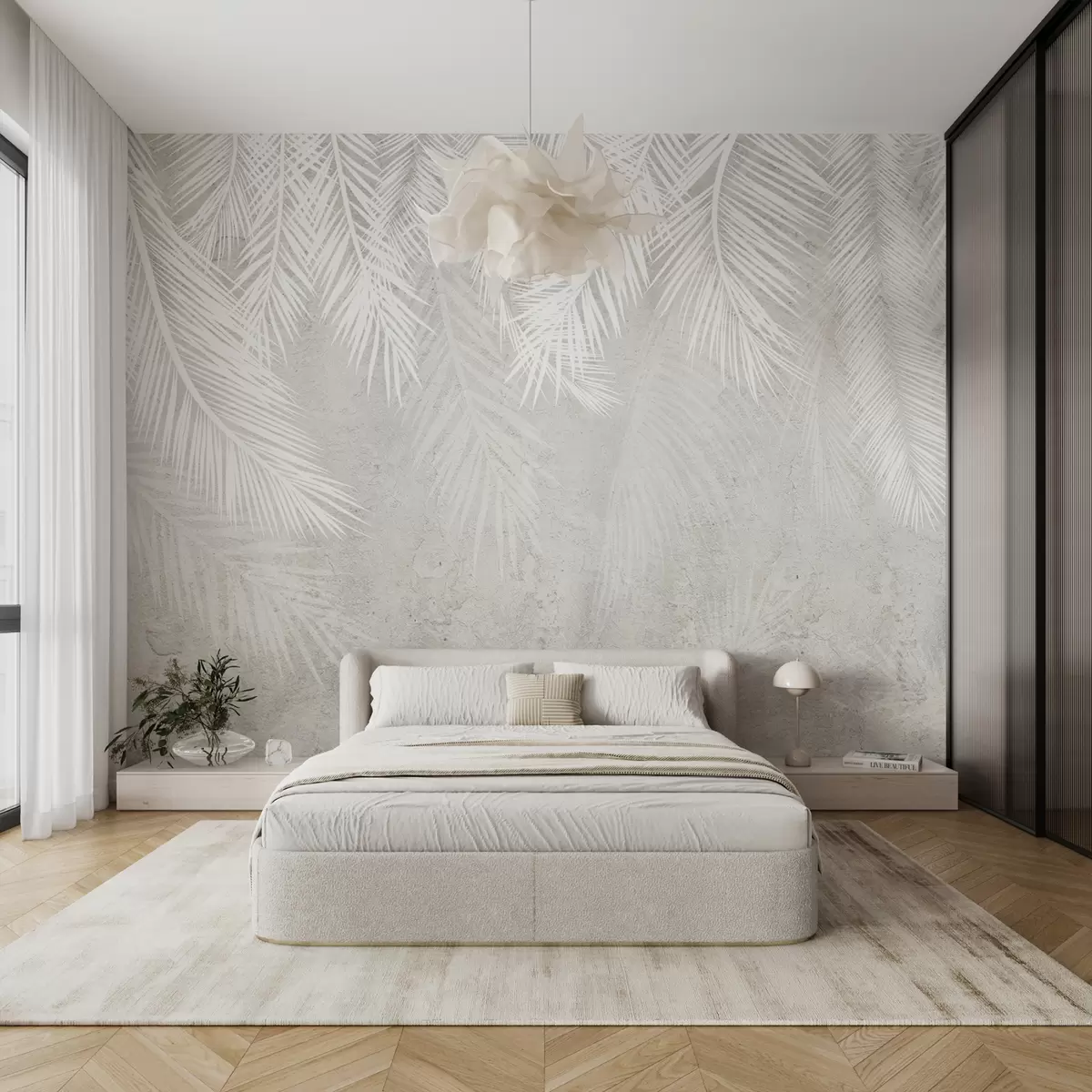 Fotobehang Witte fragiele palmbladeren met grungetextuur N° u94286