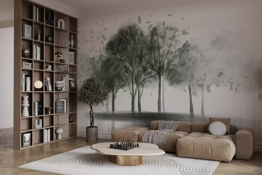 Muurschildering Het bos in de lichte ochtendmist. Een delicaat sfeervol schilderij in de stijl van een artistiek landschap.