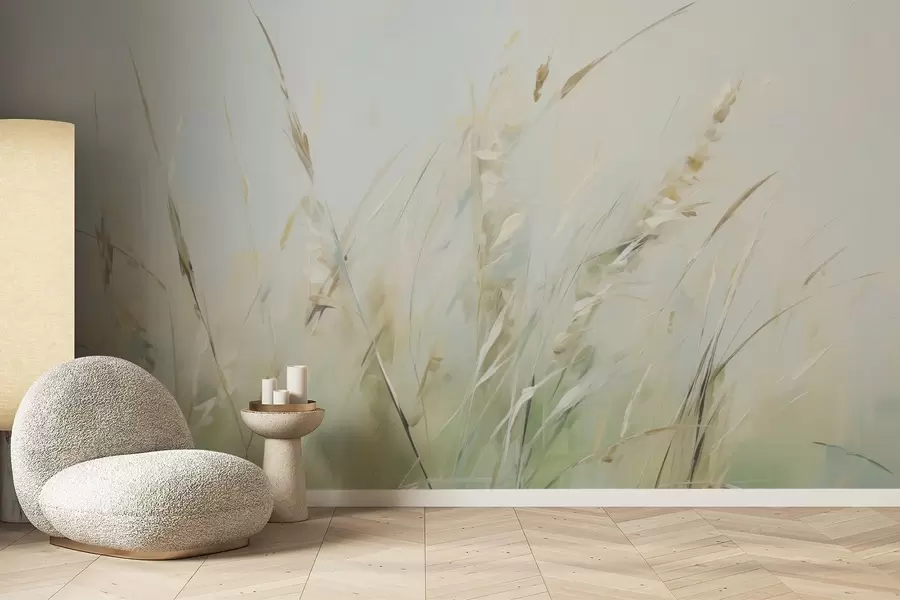 Muurschildering Pampagras tegen een achtergrond van lijnen in beige tinten