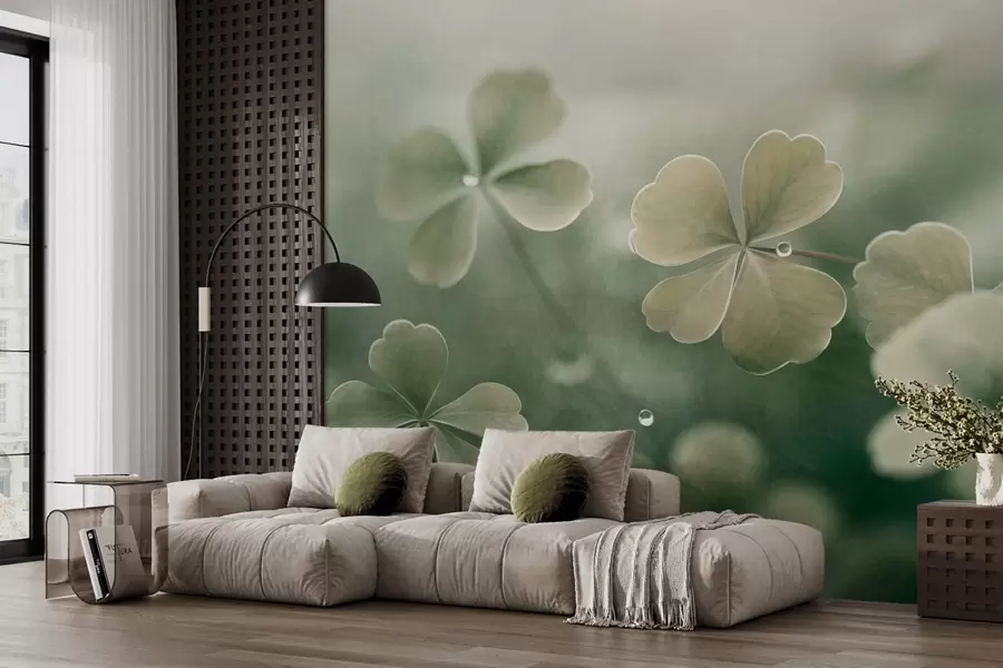 Muurschildering Klavertjes vier met waterdruppels, lichtgroene kleur, zachte focus, wazige achtergrond, structuurprint