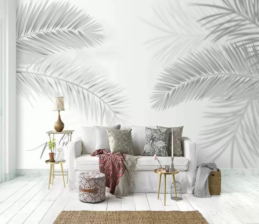 Muurschildering Palmbladeren, bloemenpatroon, minimalisme, tropisch, grijze kleuren