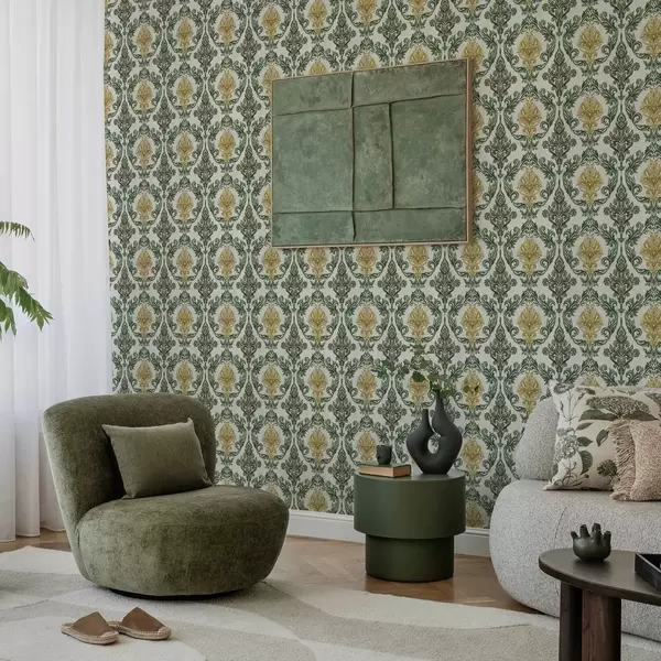 Behang Damast met groene krullen op een lichte achtergrond a00828v1