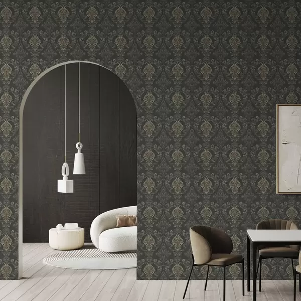 Behang Damast op donkere grafietgrond, olijf-oker accenten a00828v5