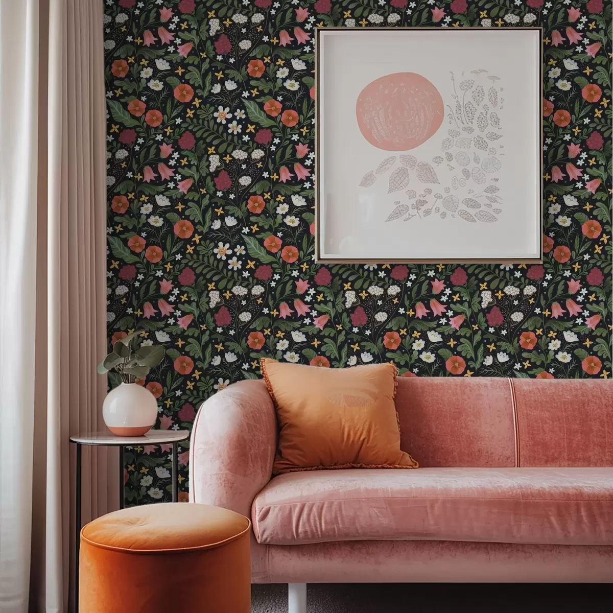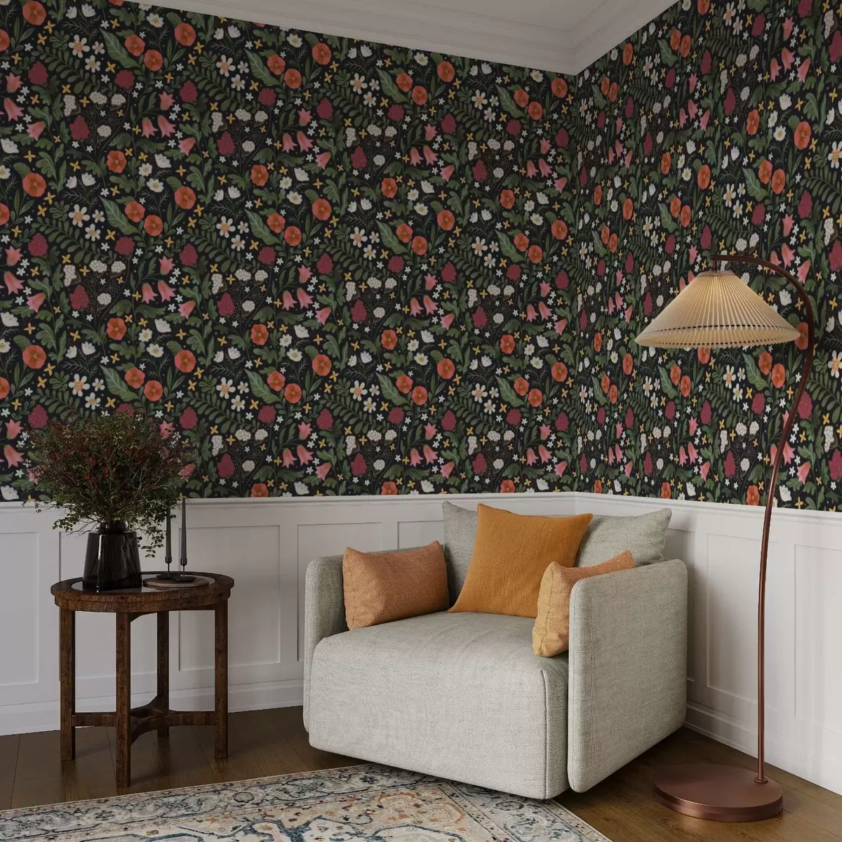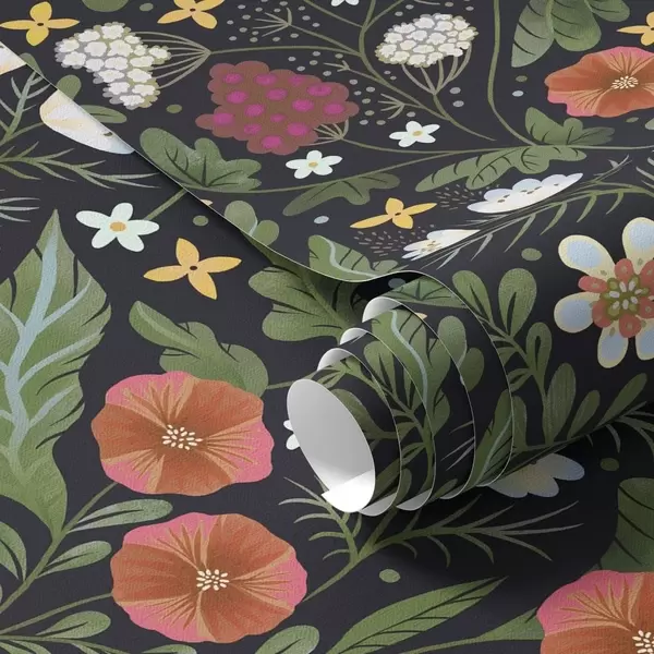 Behang Wilde bloemen en bessen op een diepzwarte achtergrond Nr. a00849v3