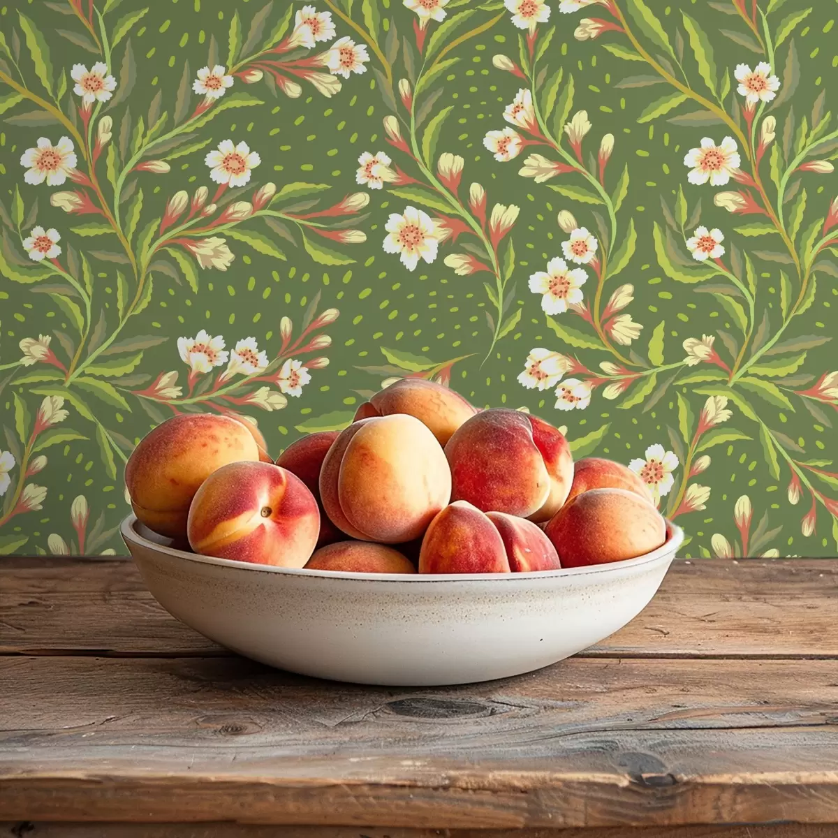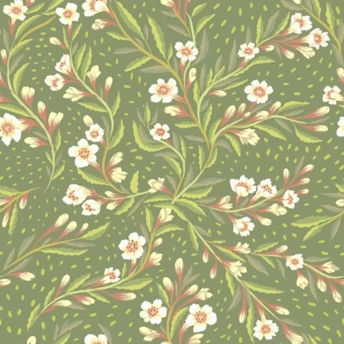 Fotobehang Veegende takken met crèmekleurige bloemen op een olijfgroene achtergrond N° a00850