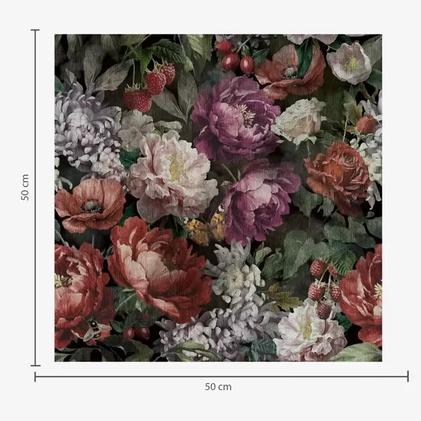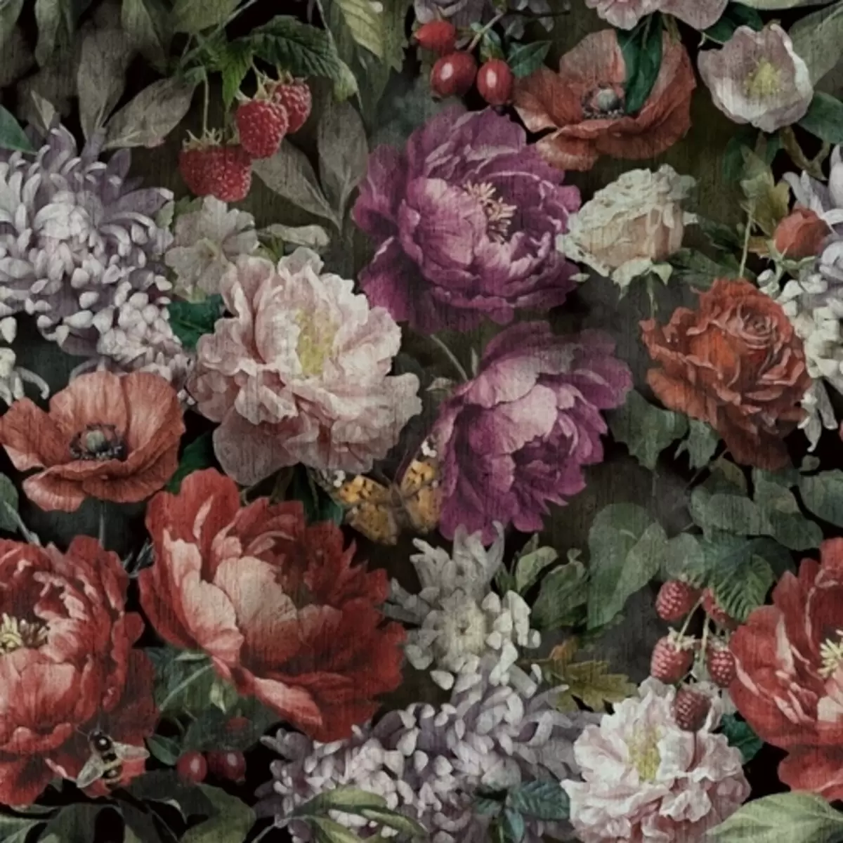 Fotobehang Donkere dramatische pioenrozen, bessen en vlinder op zwart N° a00862