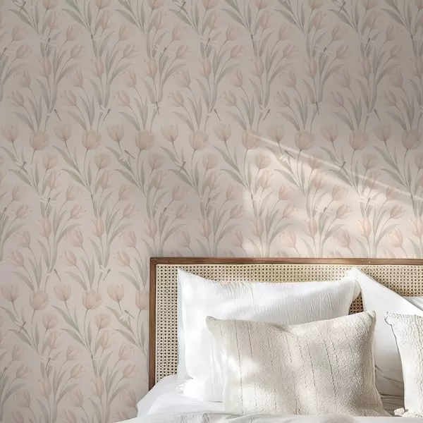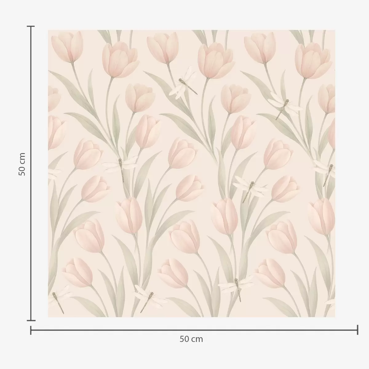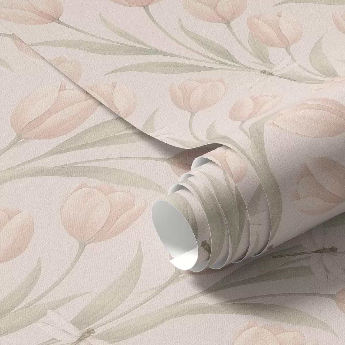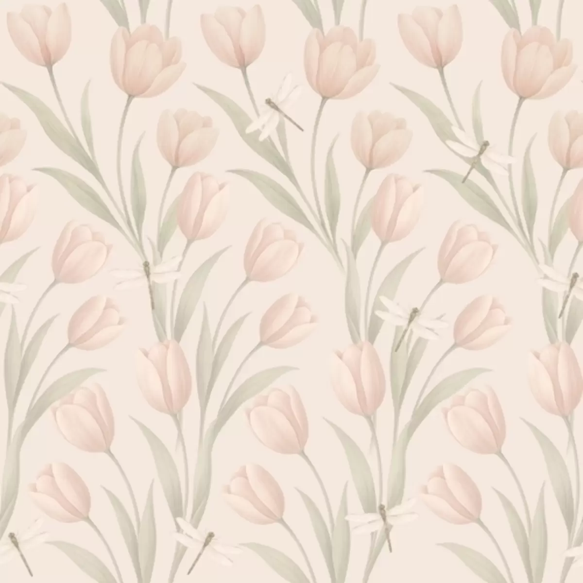 Fotobehang Pastelkleurige tulpen met libellen op blush N° a00876