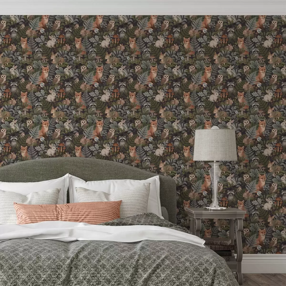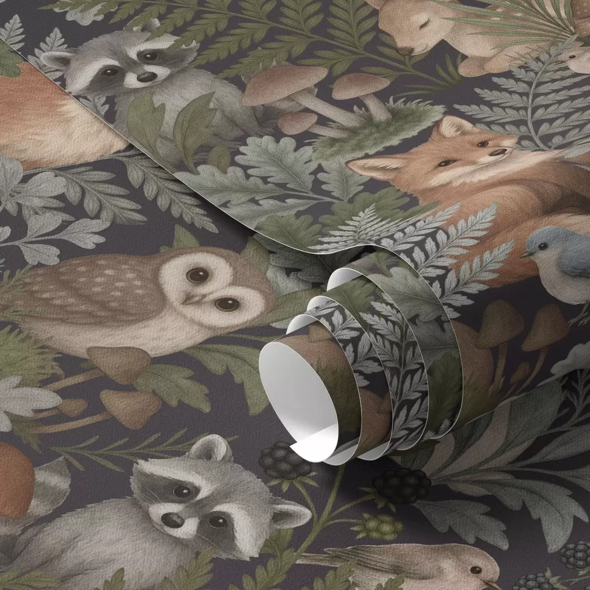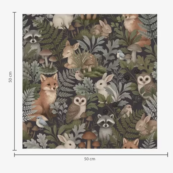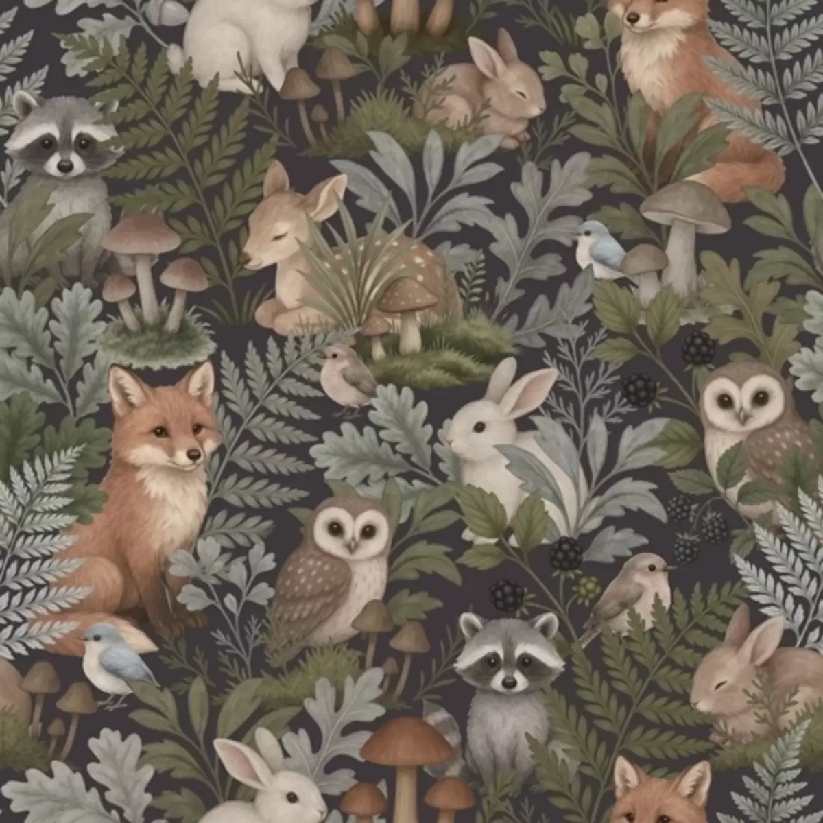Fotobehang Bosdieren en varens op diep houtskool N° a00880