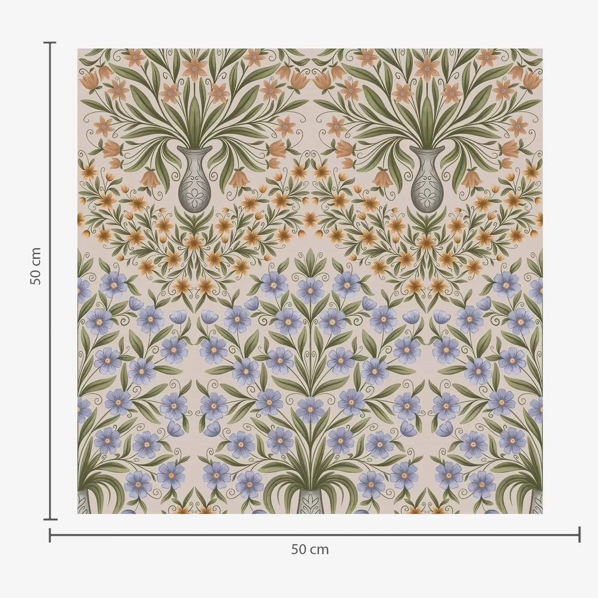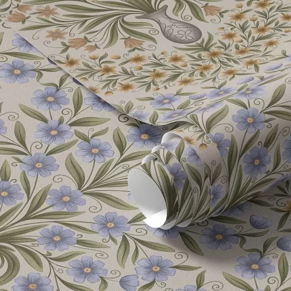 Behang Folk vazen met blauwe bloesems en olijfbladeren op blush Nr. a00900
