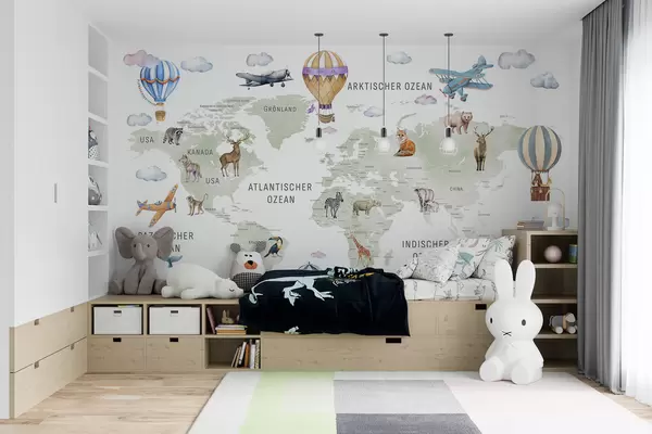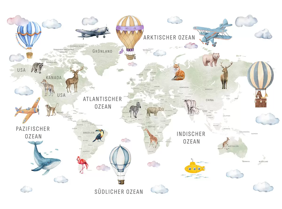 Fotobehang Kinderkaart in aquarelstijl met dieren en heteluchtballonnen. Duitse taal. Groene kleur. N° c00001de