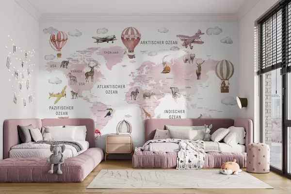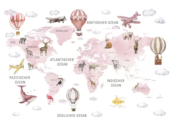 Fotobehang Kinderkaart in aquarelstijl met dieren en heteluchtballonnen. Duitse taal. Roze kleur. N° c00001dev3