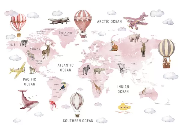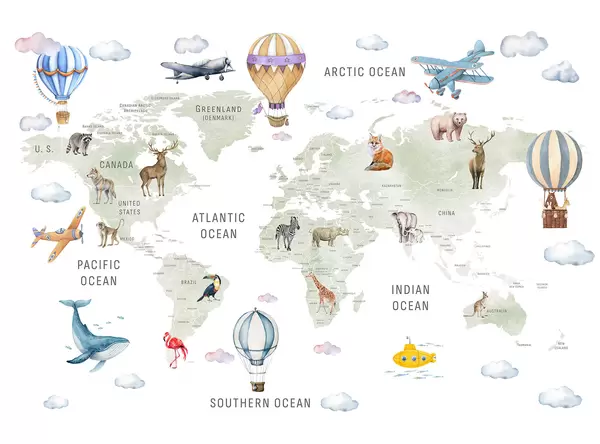 Fotobehang Kinderkaart in aquarelstijl met dieren en heteluchtballonnen. Engelse taal. Groene kleur. N° c00001en