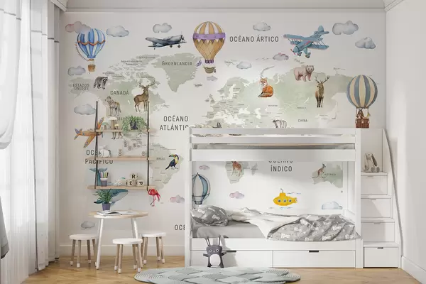 Fotobehang Kinderkaart in aquarelstijl met dieren en heteluchtballonnen. Spaanse taal. Groene kleur. N° c00001es