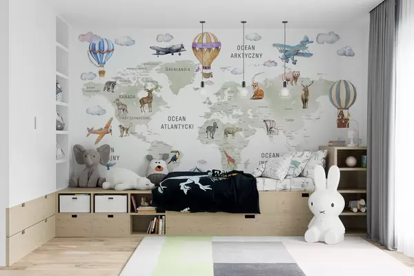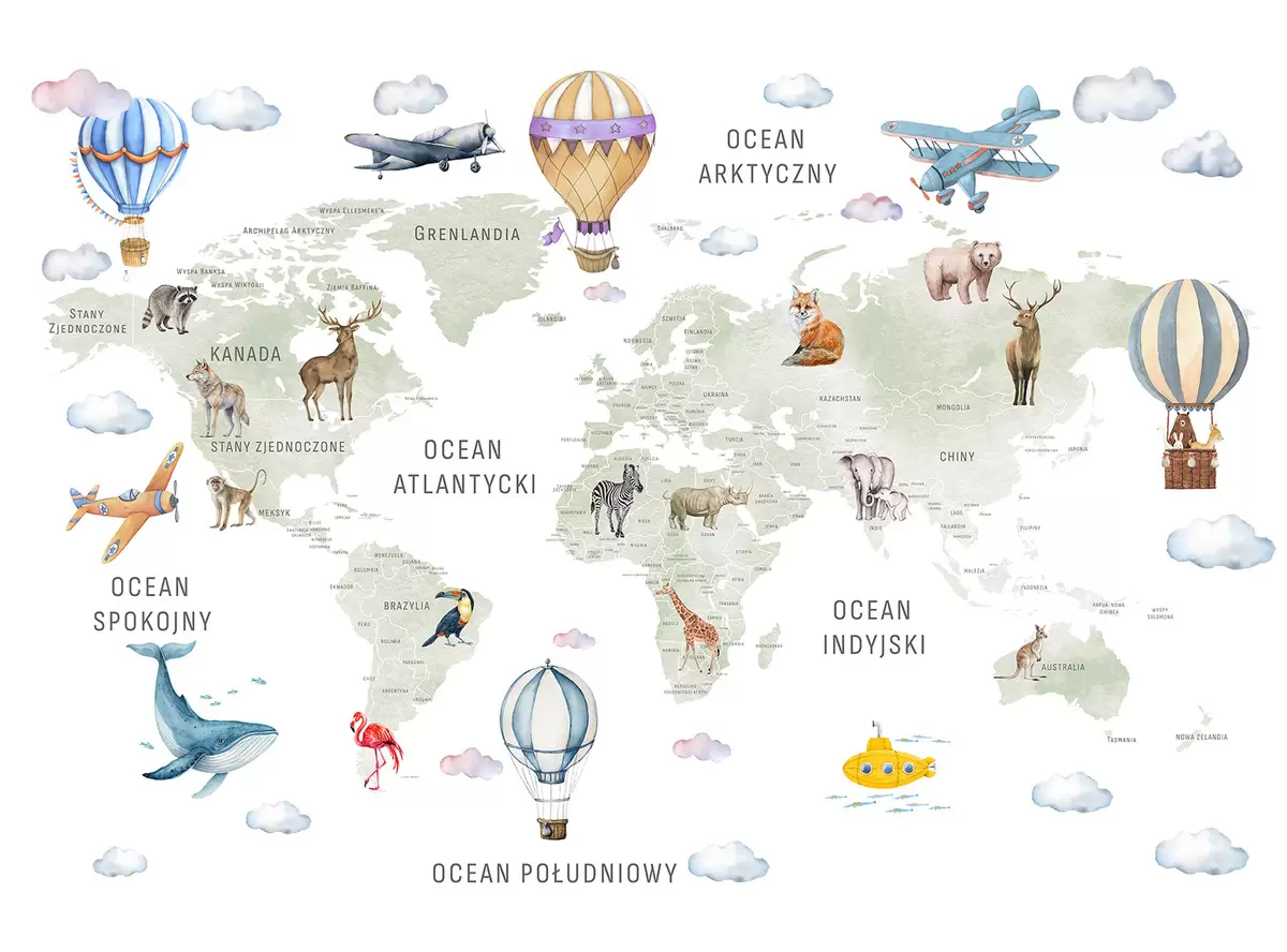 Fotobehang Kinderkaart in aquarelstijl met dieren en heteluchtballonnen. Poolse taal. Groene kleur. N° c00001pl