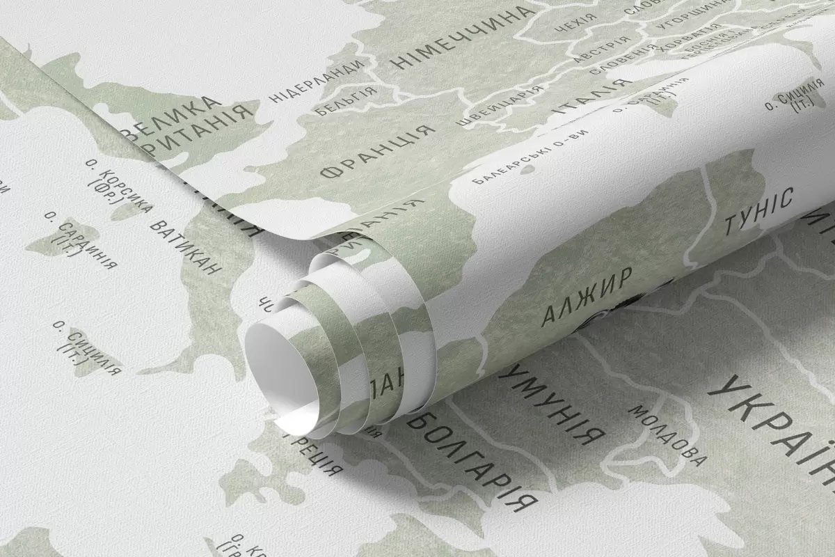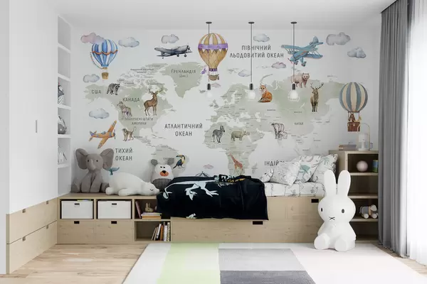 Fotobehang Kinderkaart in aquarelstijl met dieren en heteluchtballonnen. Oekraïense taal. Groene kleur. N° c00001uk