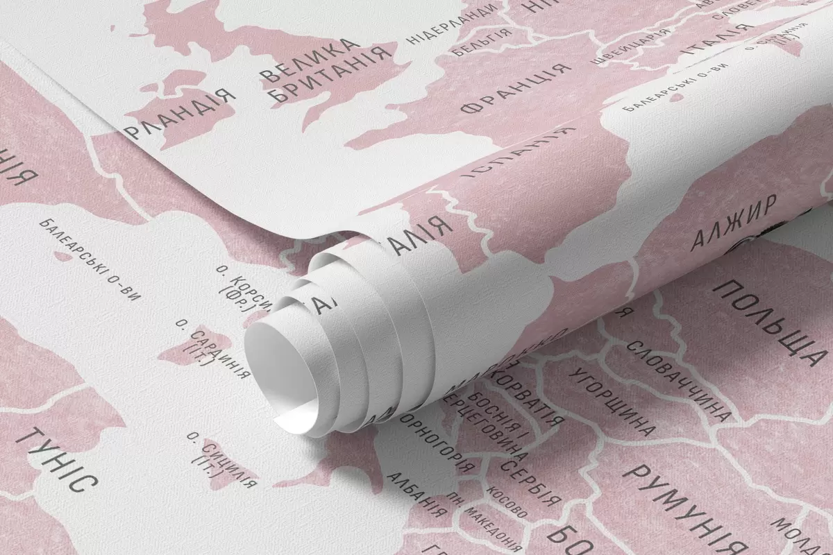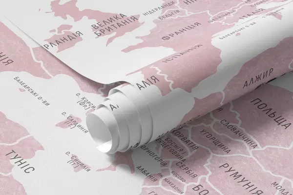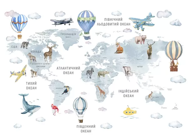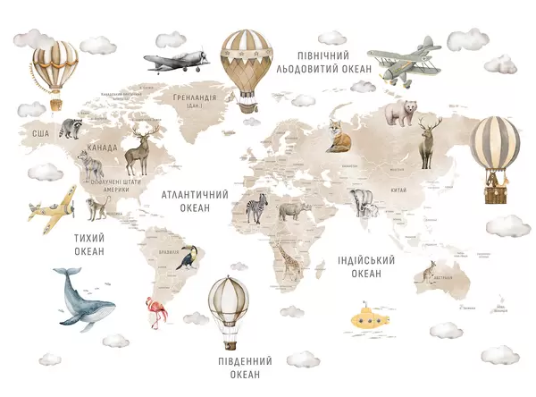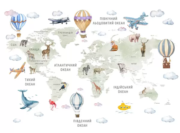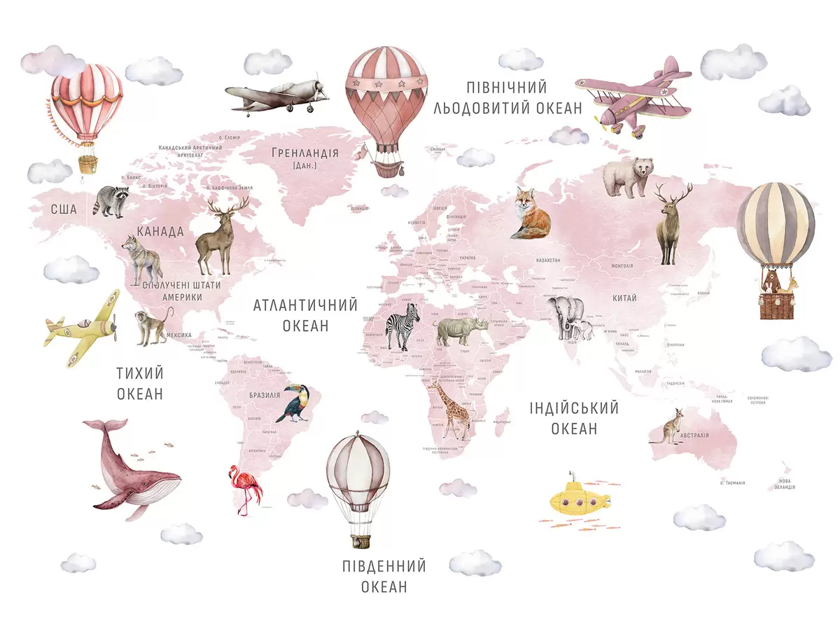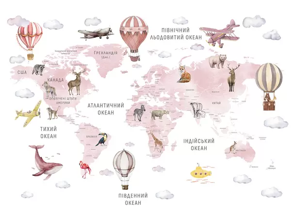 Fotobehang Kinderkaart in aquarelstijl met dieren en heteluchtballonnen. Oekraïense taal. Roze kleur. N° c00001ukv3