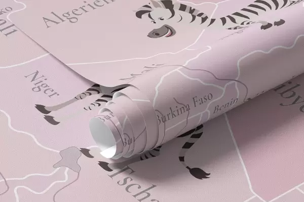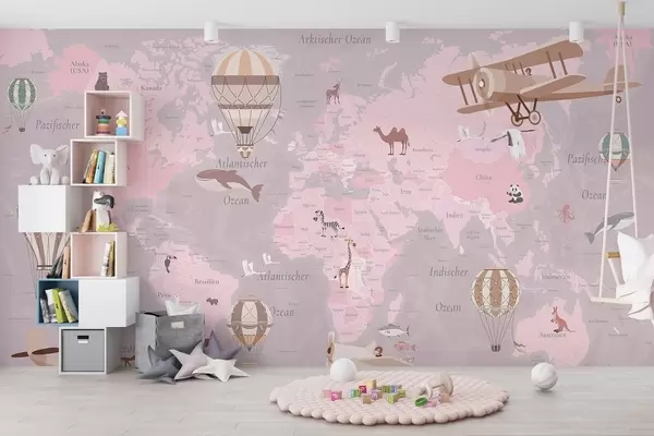 Fotobehang Wereldkaart voor kinderen met dieren, vliegtuigen en heteluchtballonnen. Duitse taal. Roze kleur. N° c00003dev3