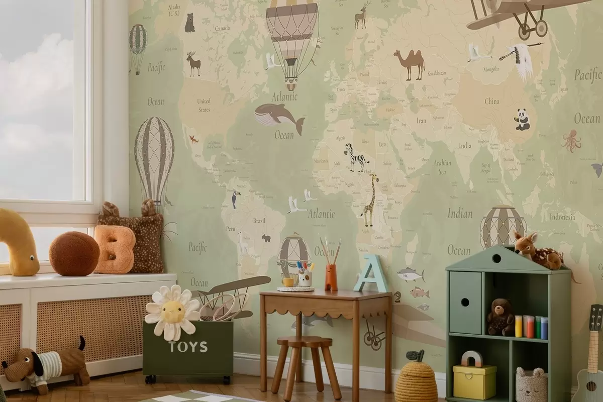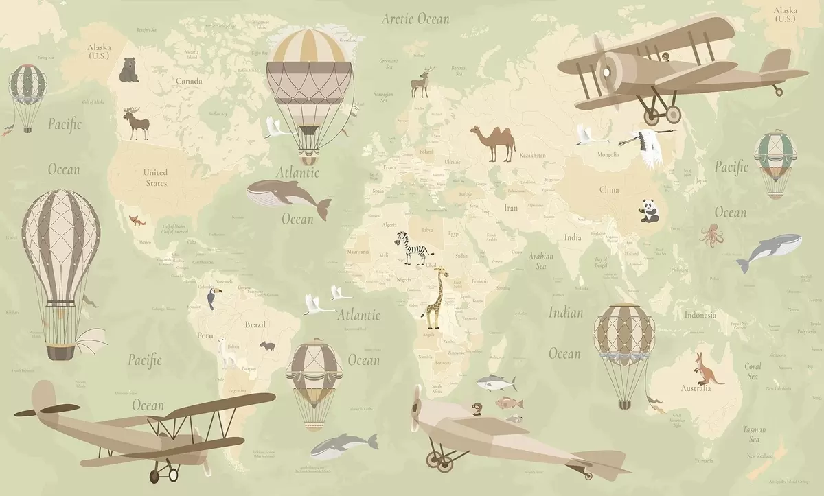 Fotobehang Wereldkaart voor kinderen met dieren, vliegtuigen en heteluchtballonnen. Engelse taal. Groene kleur. N° c00003env2